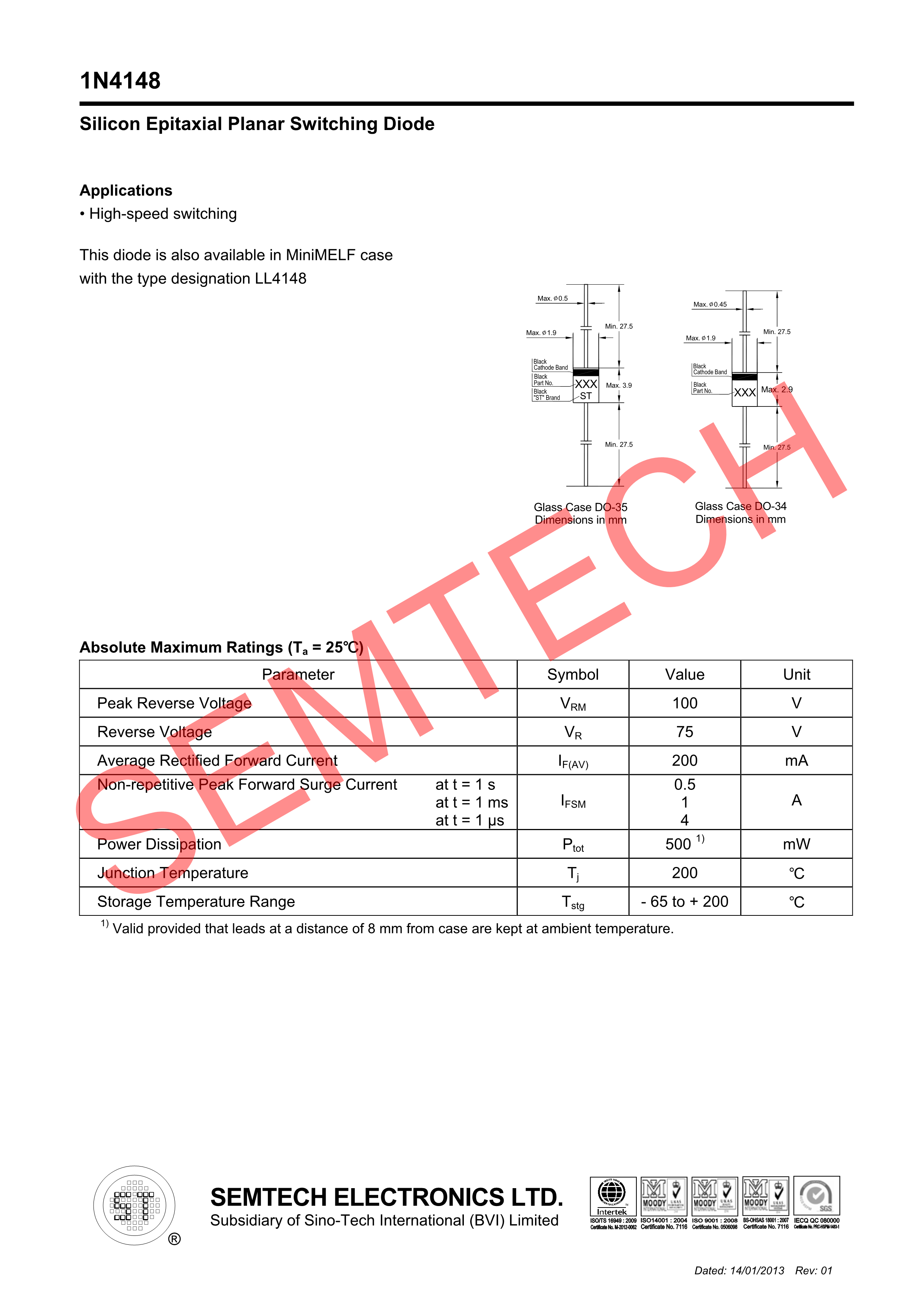 1N4148数据手册DO-35封装ST(先科)PDF规格书,中英文下载