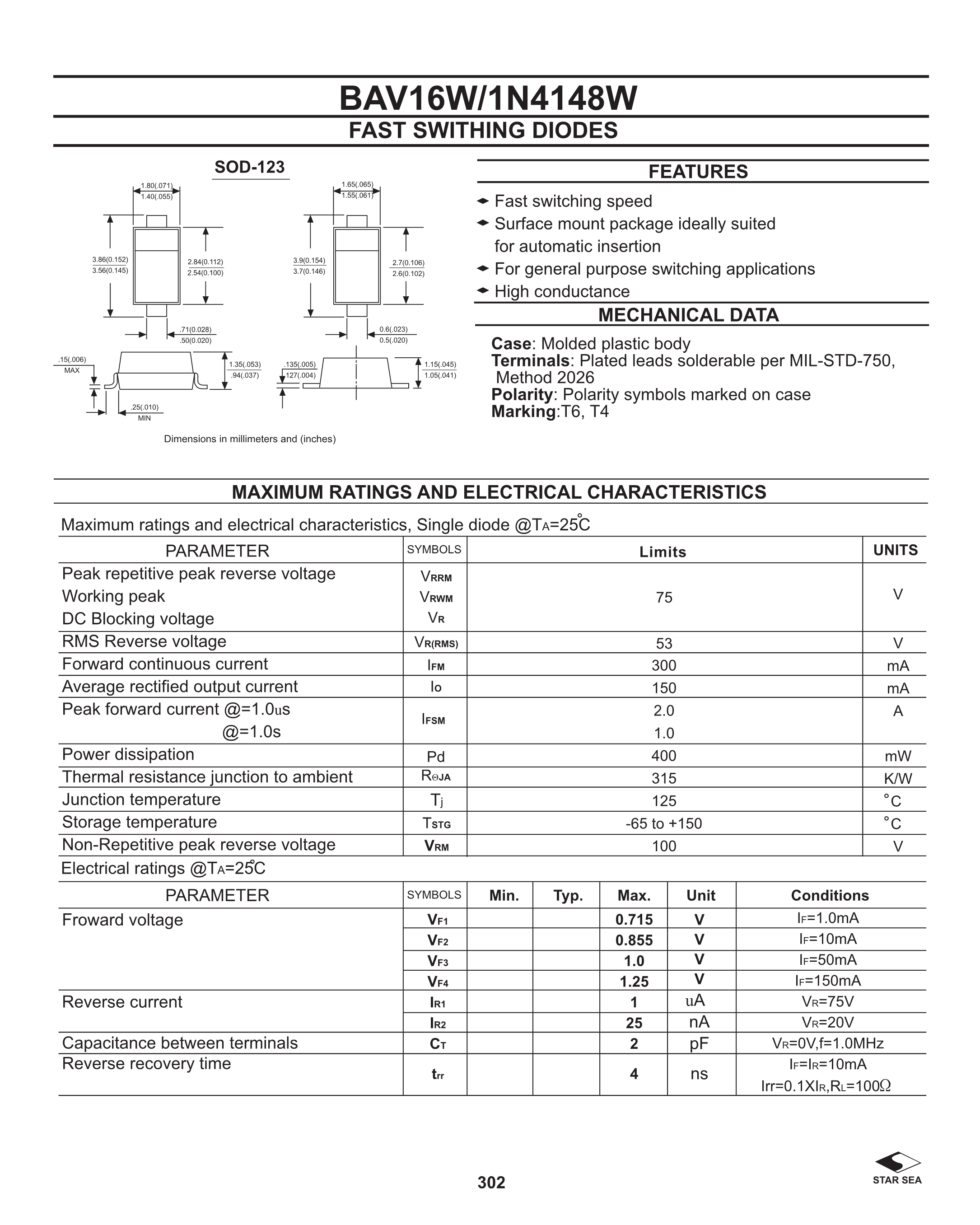 1N4148W数据手册SOD-123封装星海PDF规格书,中英文下载