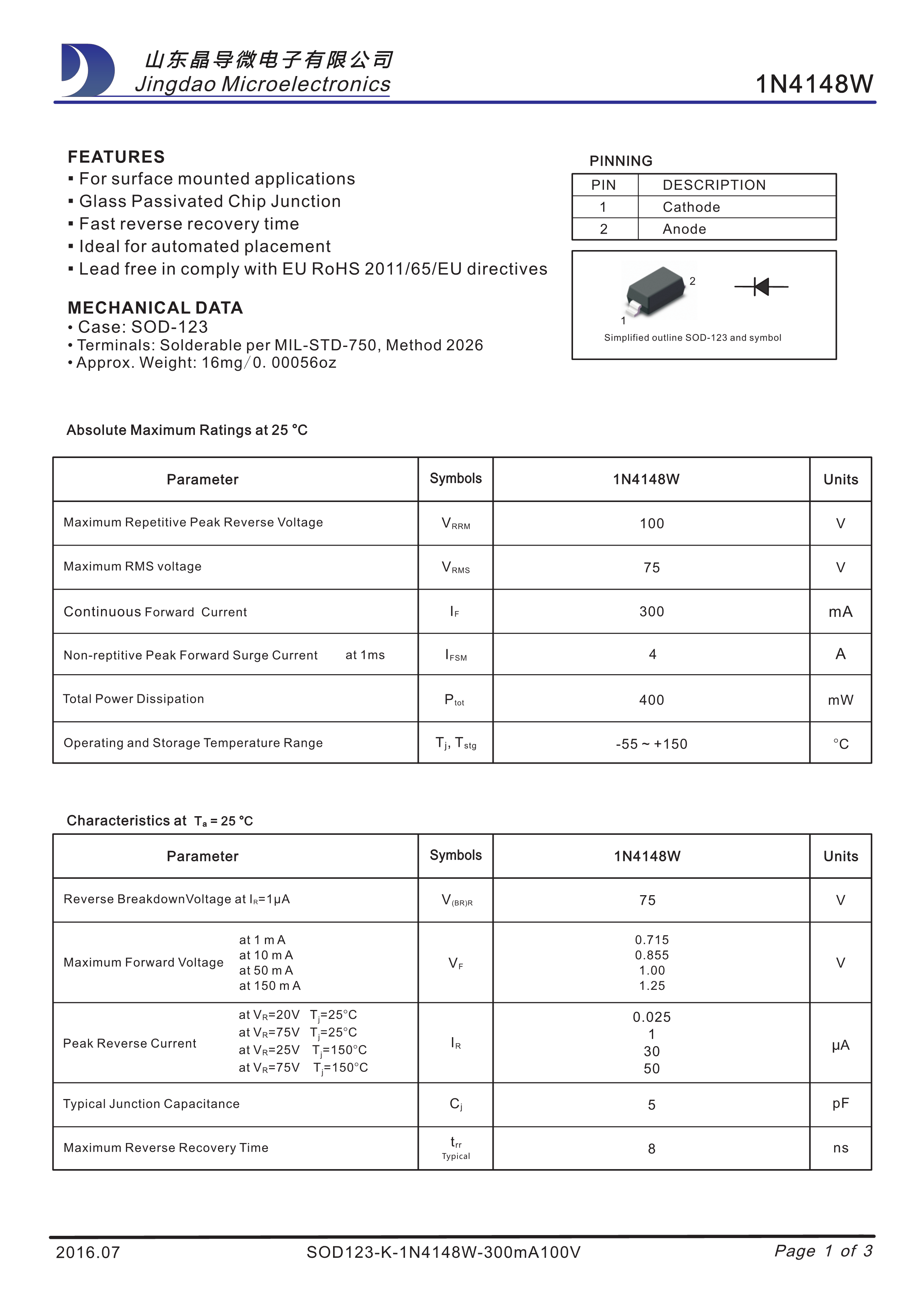 1N4148W数据手册SOD-123封装晶导微电子PDF规格书,中英文下载