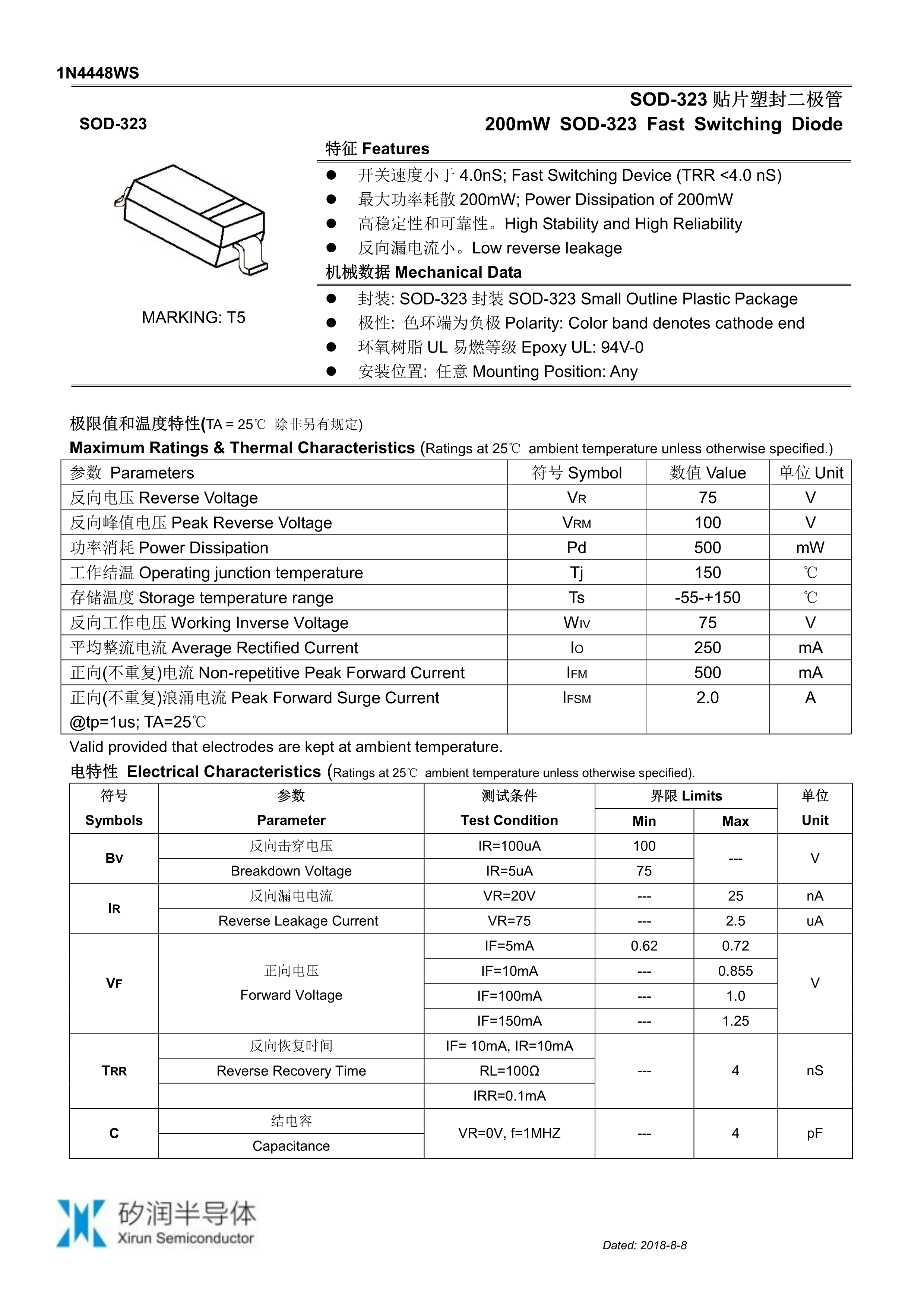 1N4448WS-T5数据手册SOD-323封装ZRE(治润)PDF规格书,中英文下载