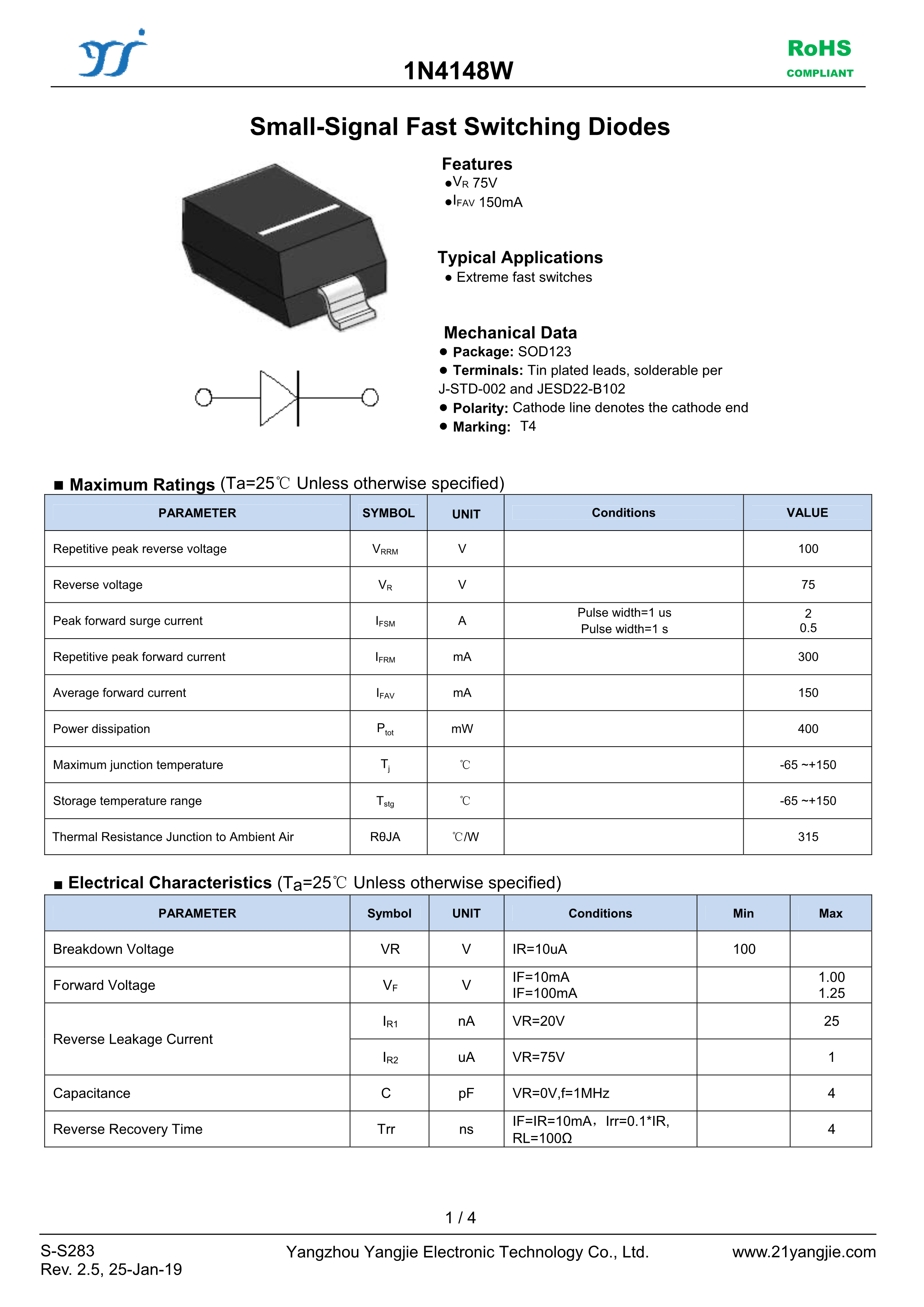 1N4148W数据手册SOD-123封装YANGJIE(扬杰)PDF规格书,中英文下载