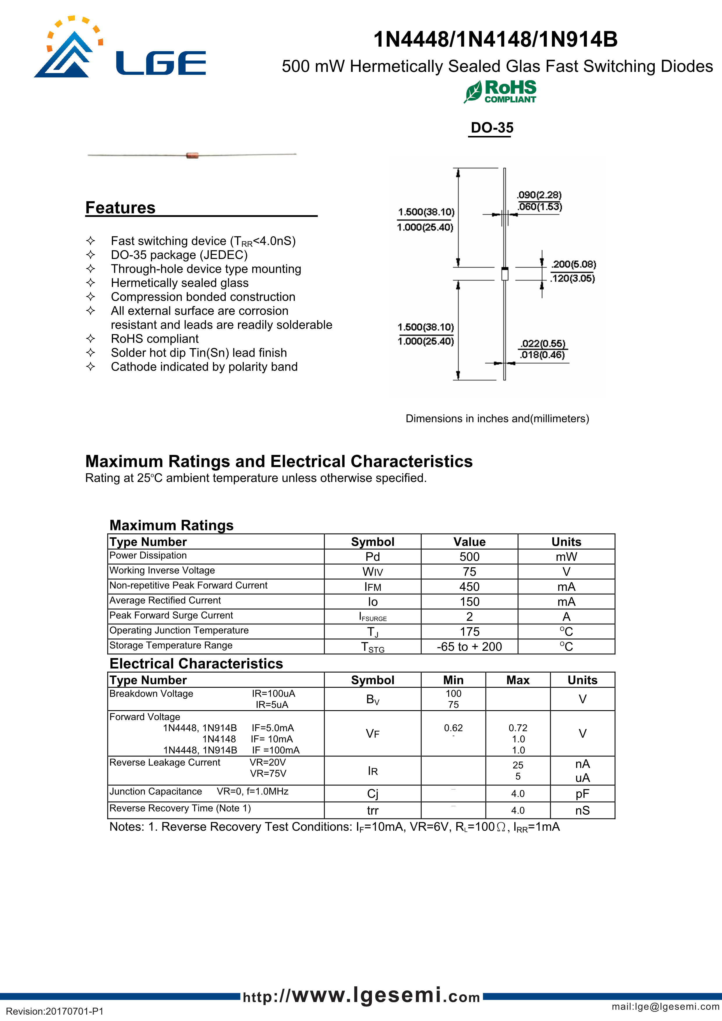 1N4148数据手册DO-35封装LGE(鲁光)PDF规格书,中英文下载