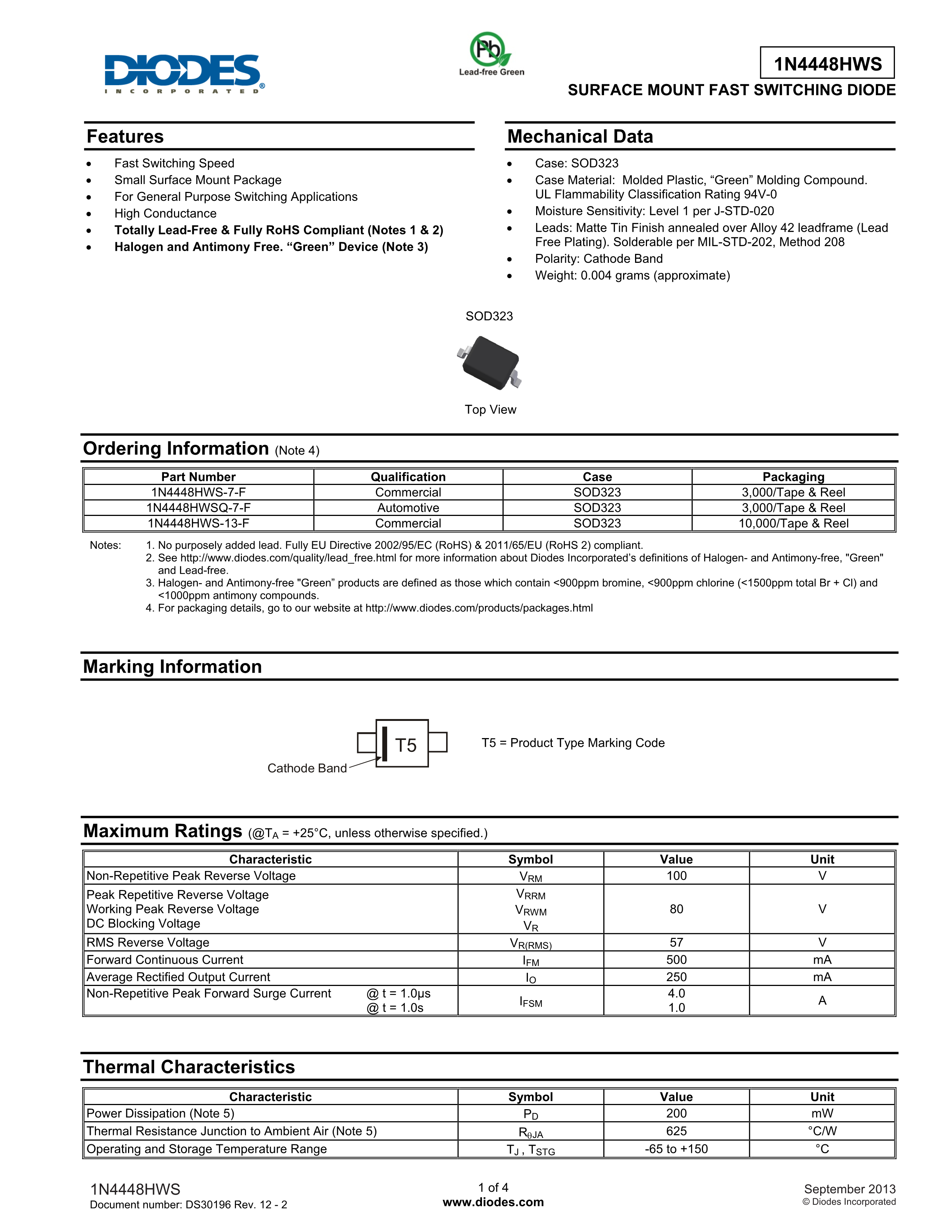 1N4448HWS-13-F数据手册SOD-323封装DIODES(美台)PDF规格书,中英文下载