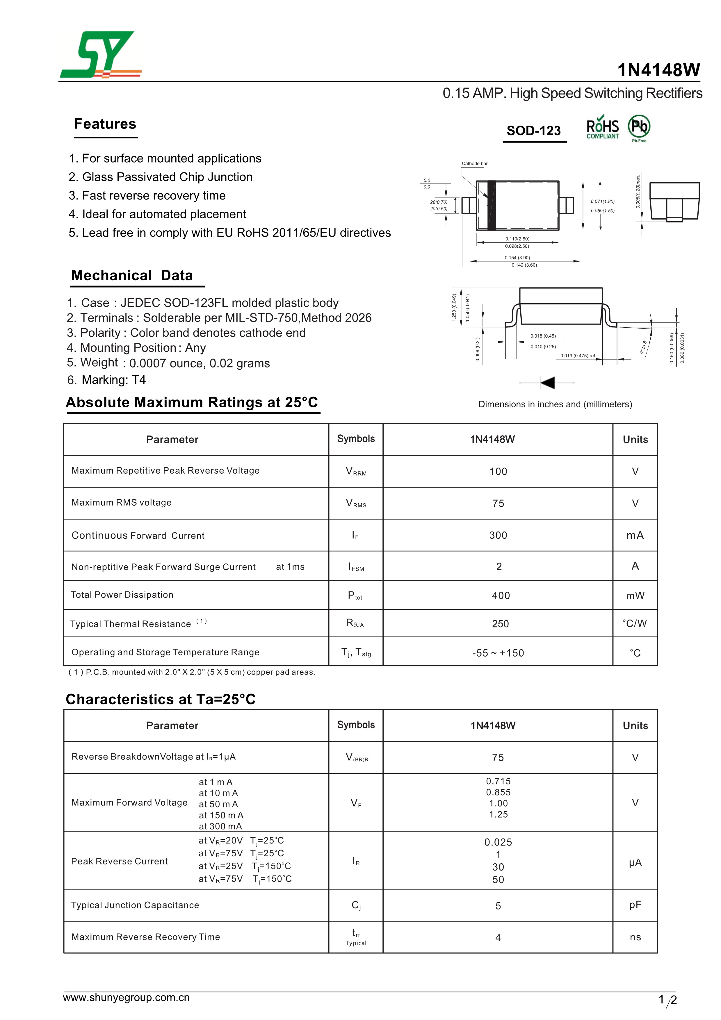 1N4148W-T4数据手册SOD-123封装SY(顺烨)PDF规格书,中英文下载