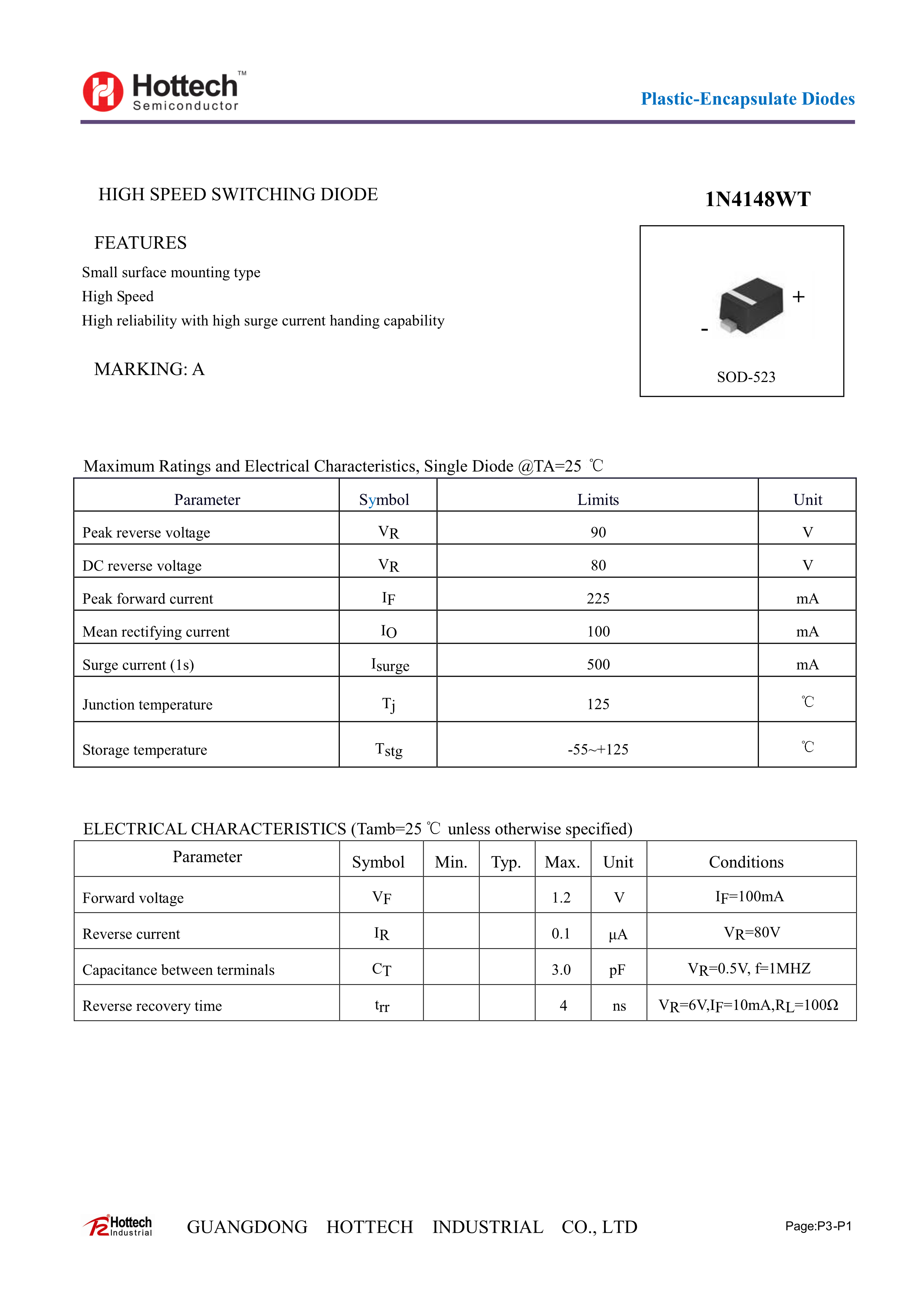 1N4148WT数据手册SOD-523封装Hottech(合科泰)PDF规格书,中英文下载