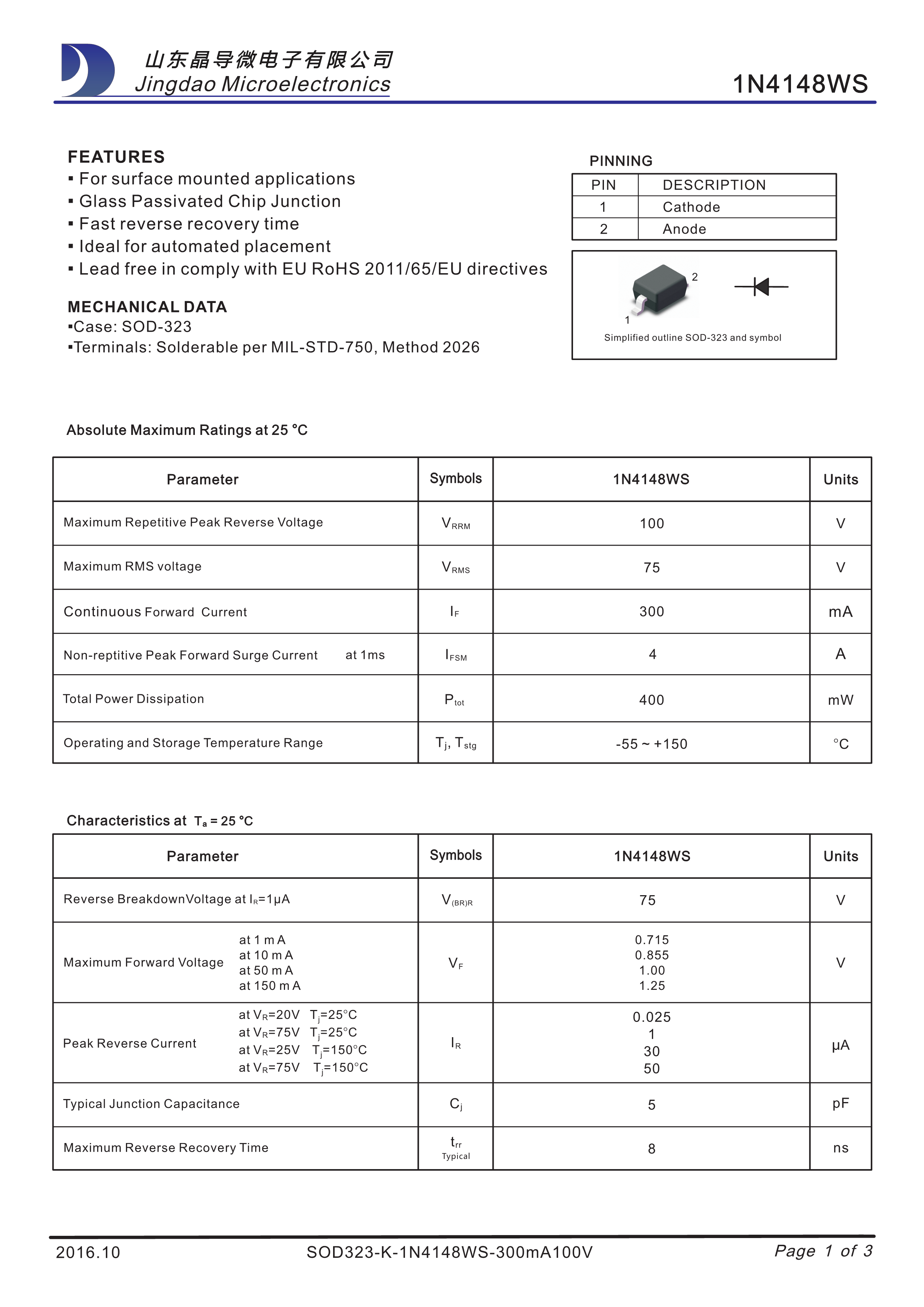 1N4148WS数据手册SOD-323封装晶导微电子PDF规格书,中英文下载
