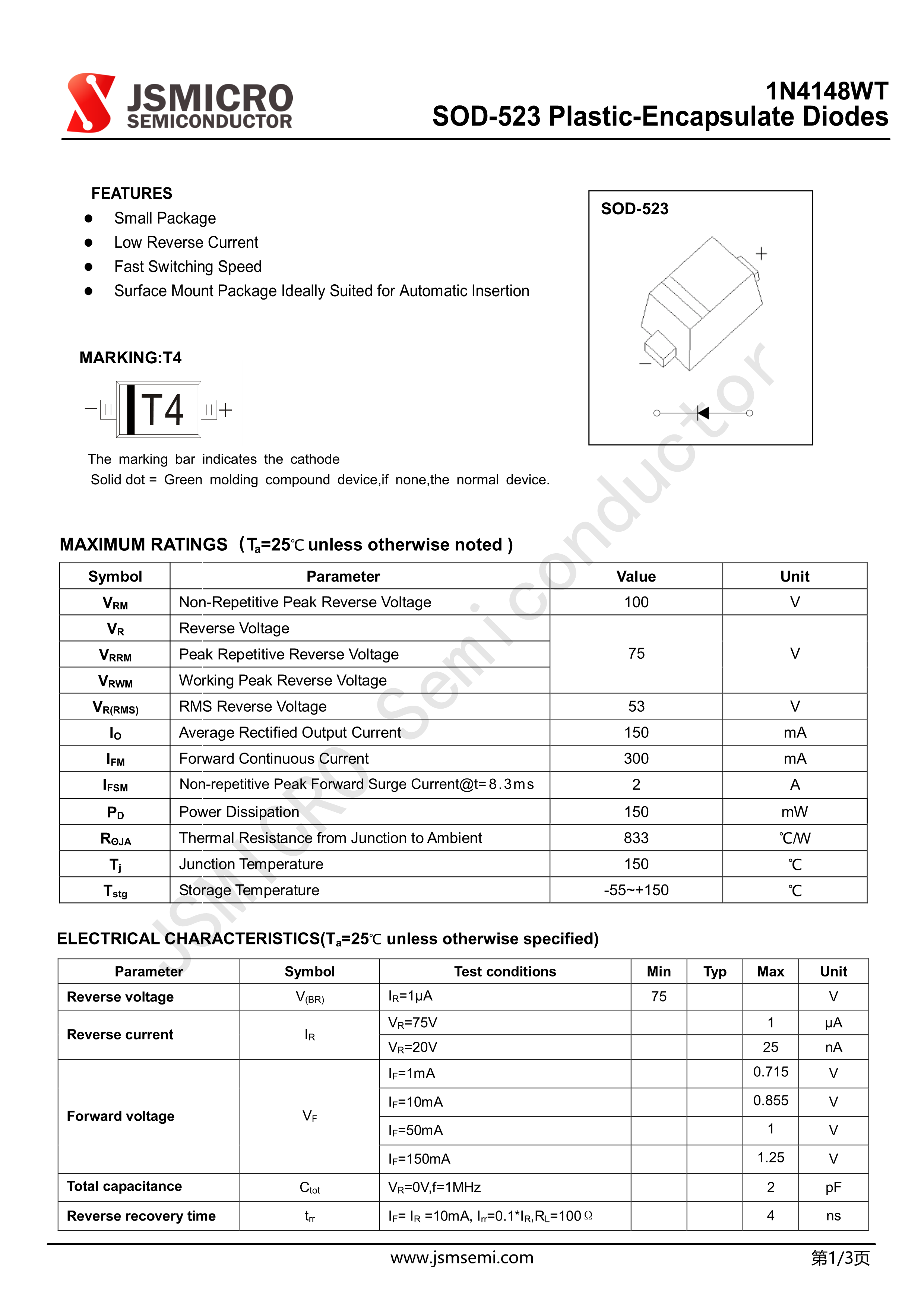 1N4148WT数据手册SOD-523封装JSMSEMI(杰盛微)PDF规格书,中英文下载