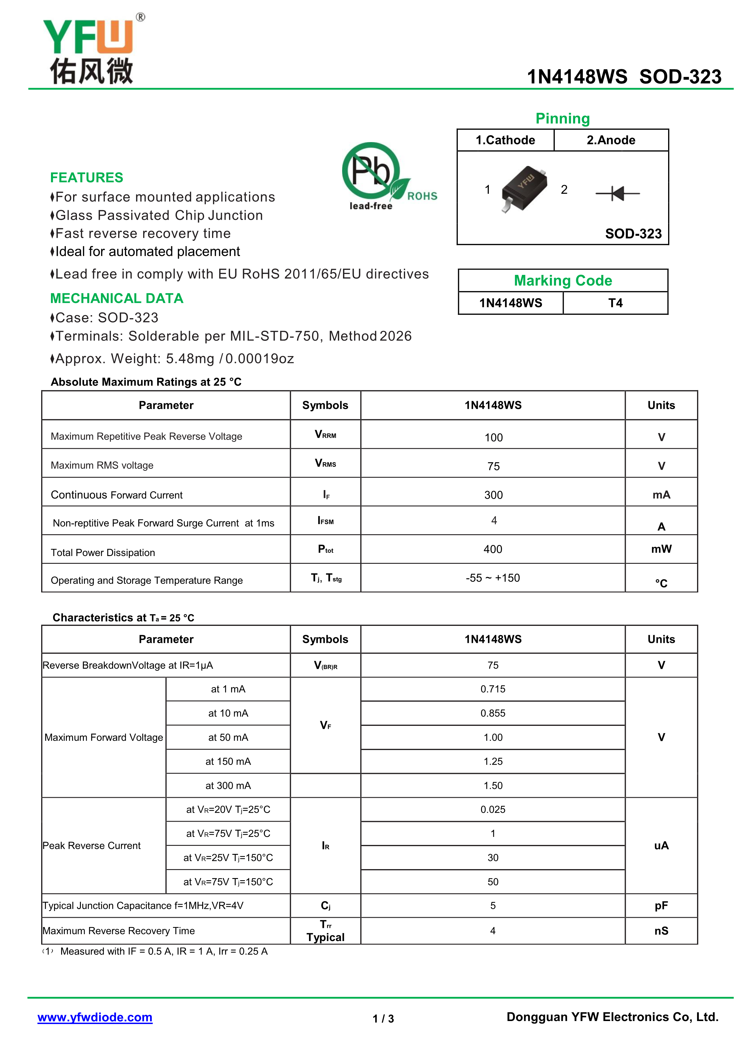 1N4148WS数据手册SOD-323封装YFSEMI(江苏佑风微)PDF规格书,中英文下载