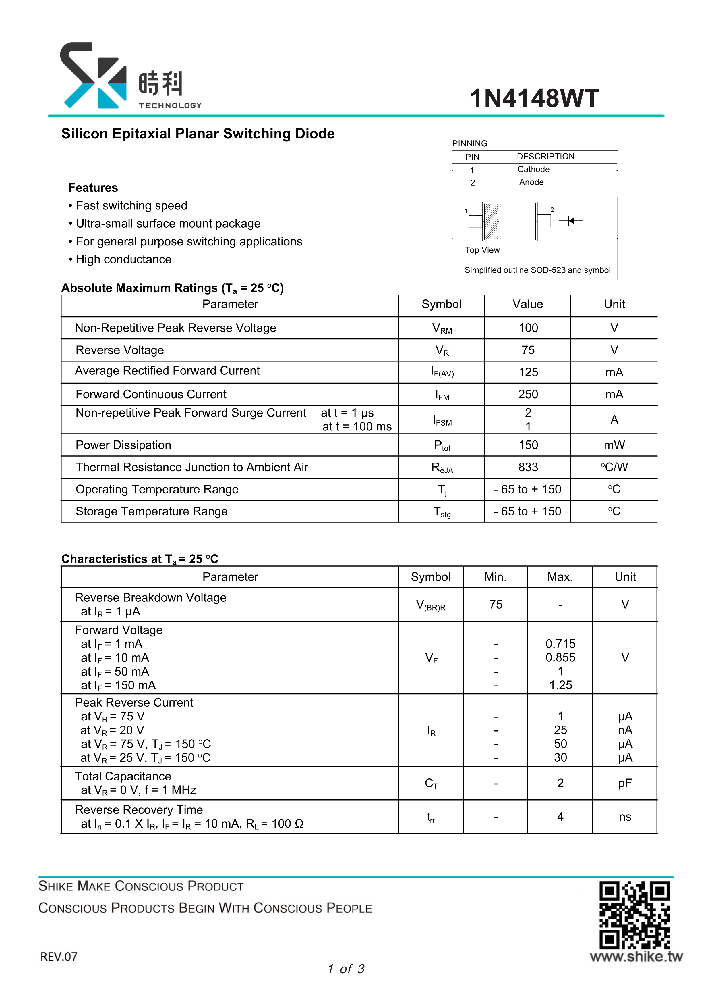 1N4148WT数据手册SOD-523封装SHIKUES(时科)PDF规格书,中英文下载
