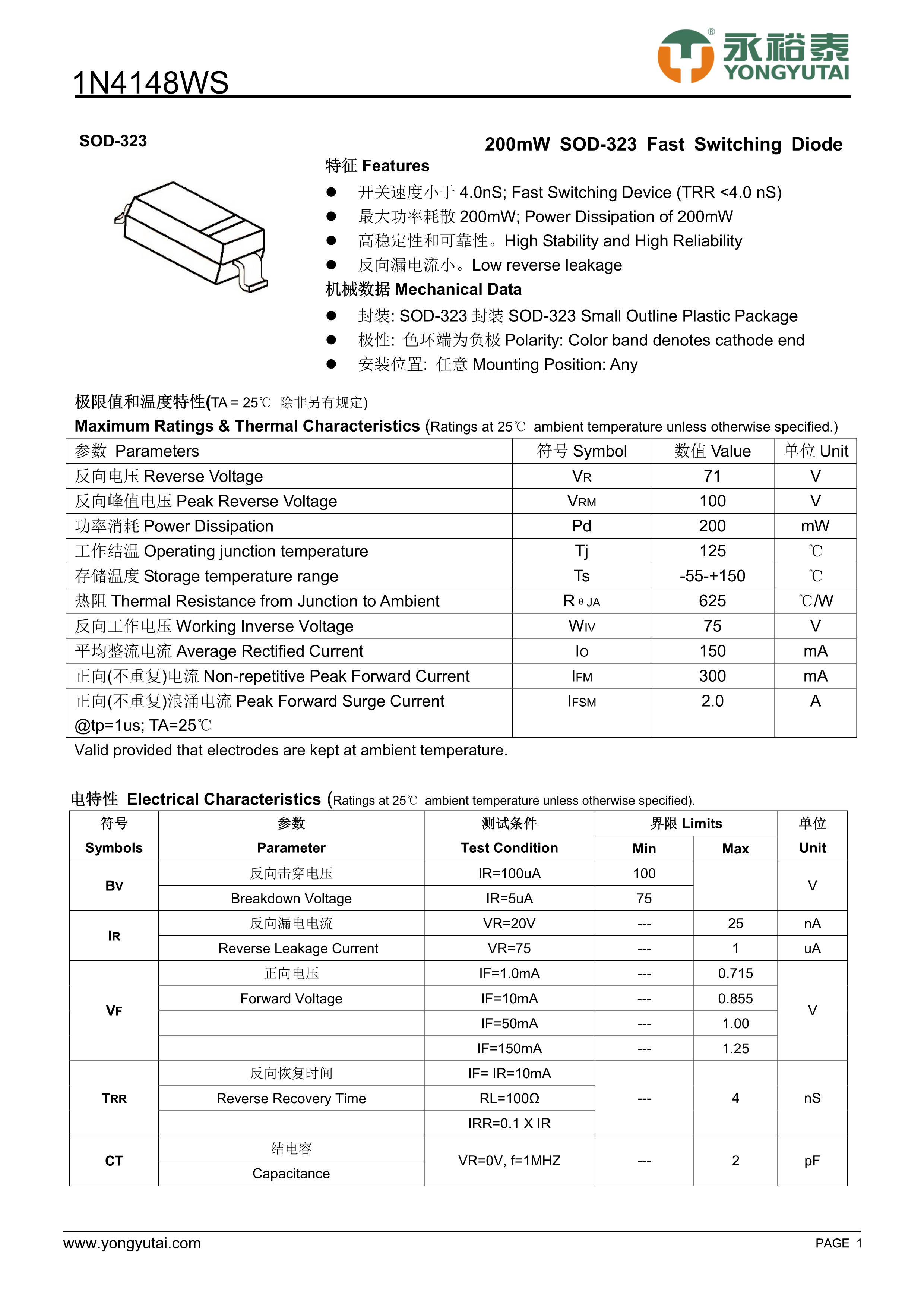 1N4148WS数据手册SOD-323封装YONGYUTAI(永裕泰)PDF规格书,中英文下载