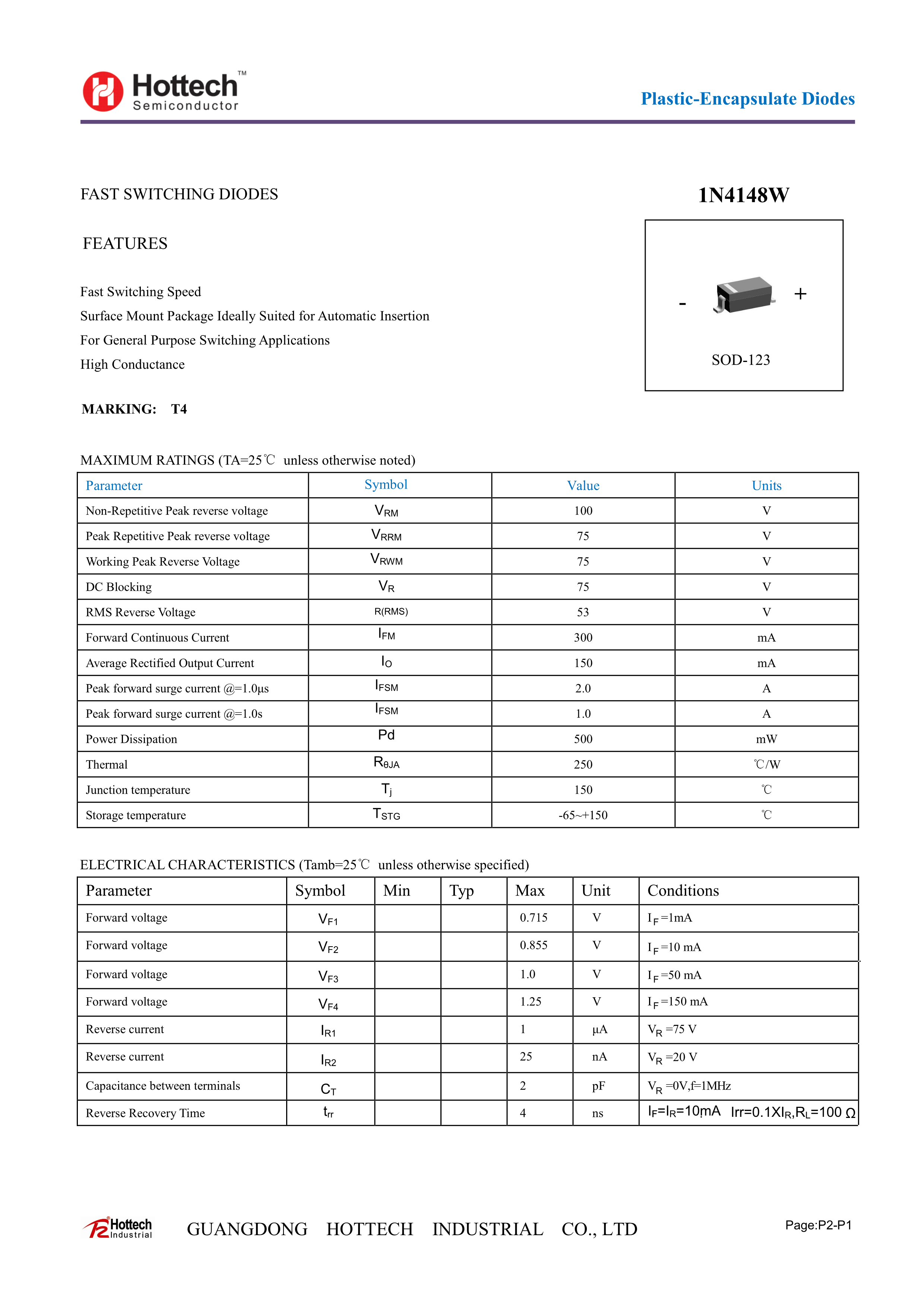 1N4148W-T4数据手册SOD-123封装Hottech(合科泰)PDF规格书,中英文下载