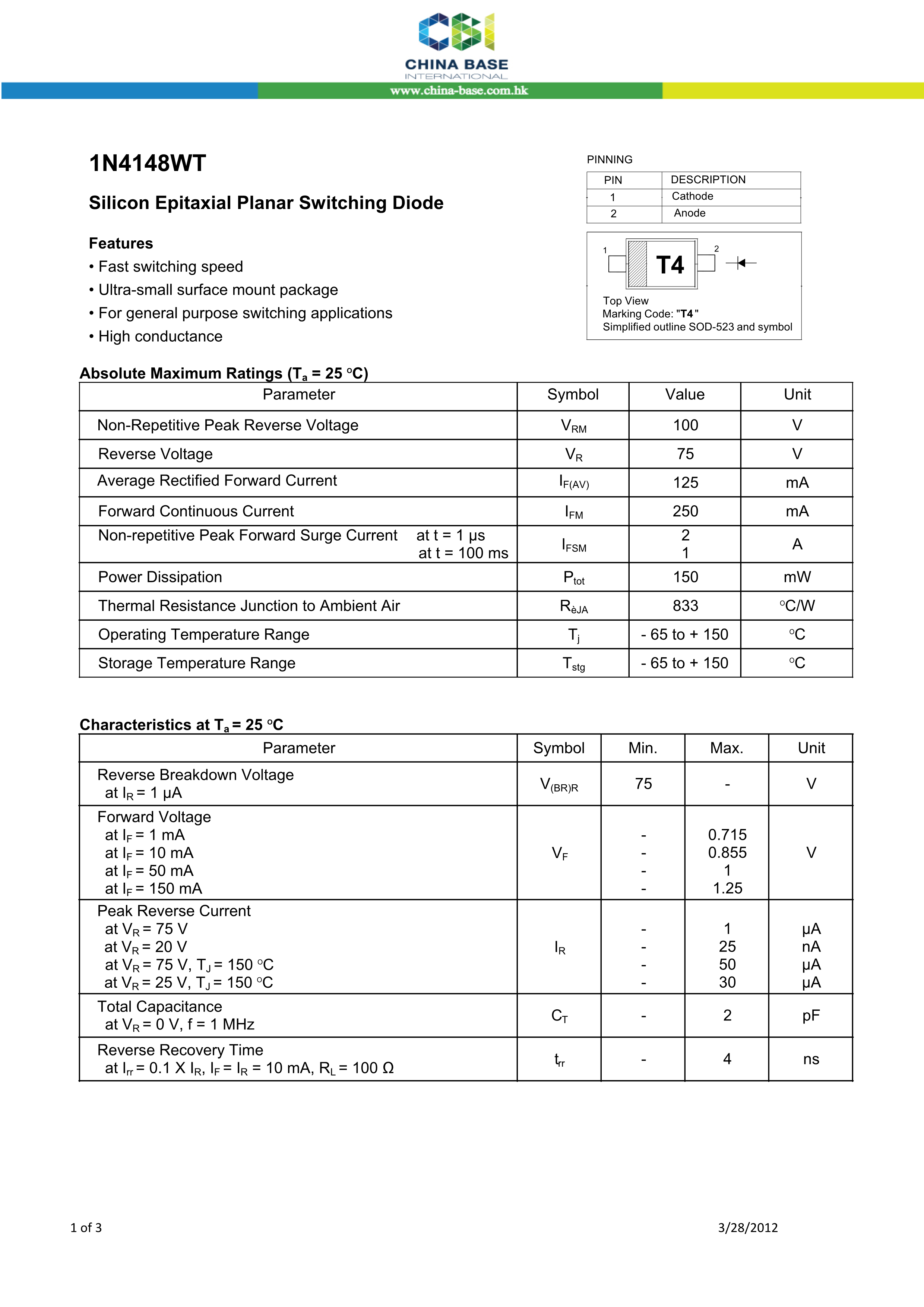 1N4148WT T4数据手册SOD-523封装CBI(创基)PDF规格书,中英文下载