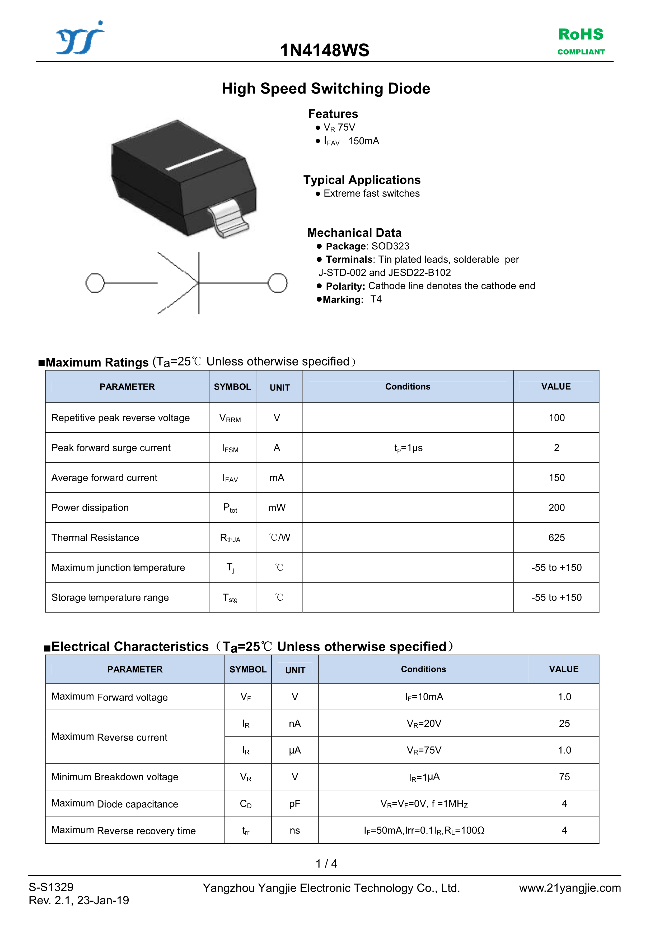 1N4148WS数据手册SOD-323封装YANGJIE(扬杰)PDF规格书,中英文下载