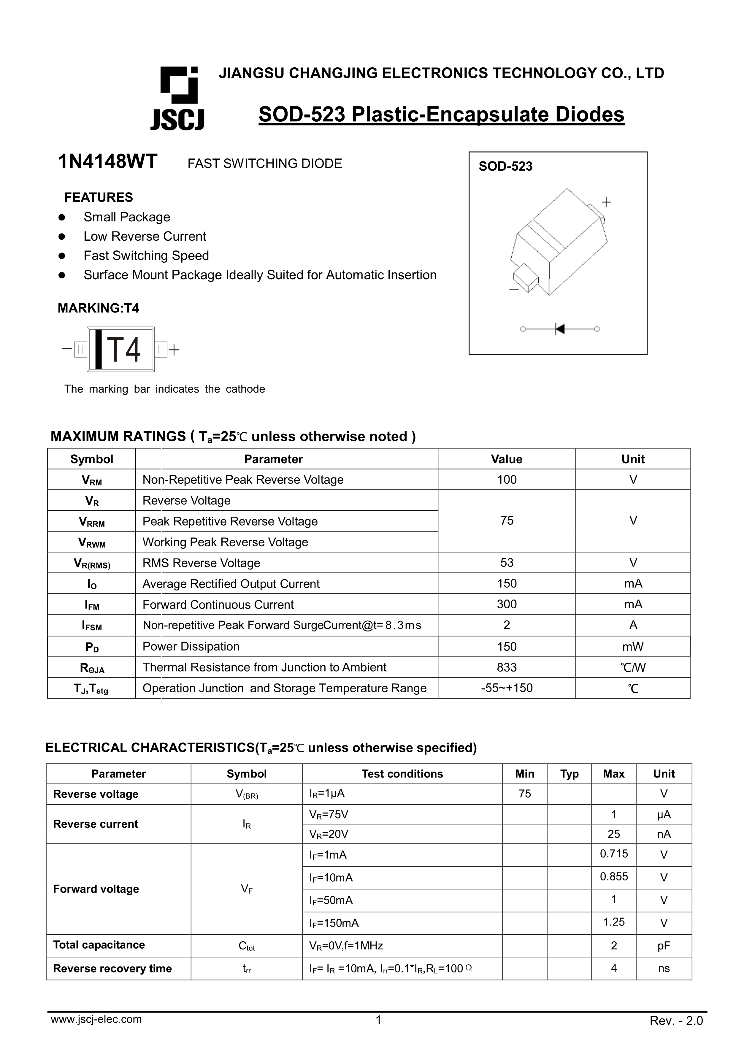 1N4148WT数据手册SOD-523封装CJ(江苏长电-长晶)PDF规格书,中英文下载