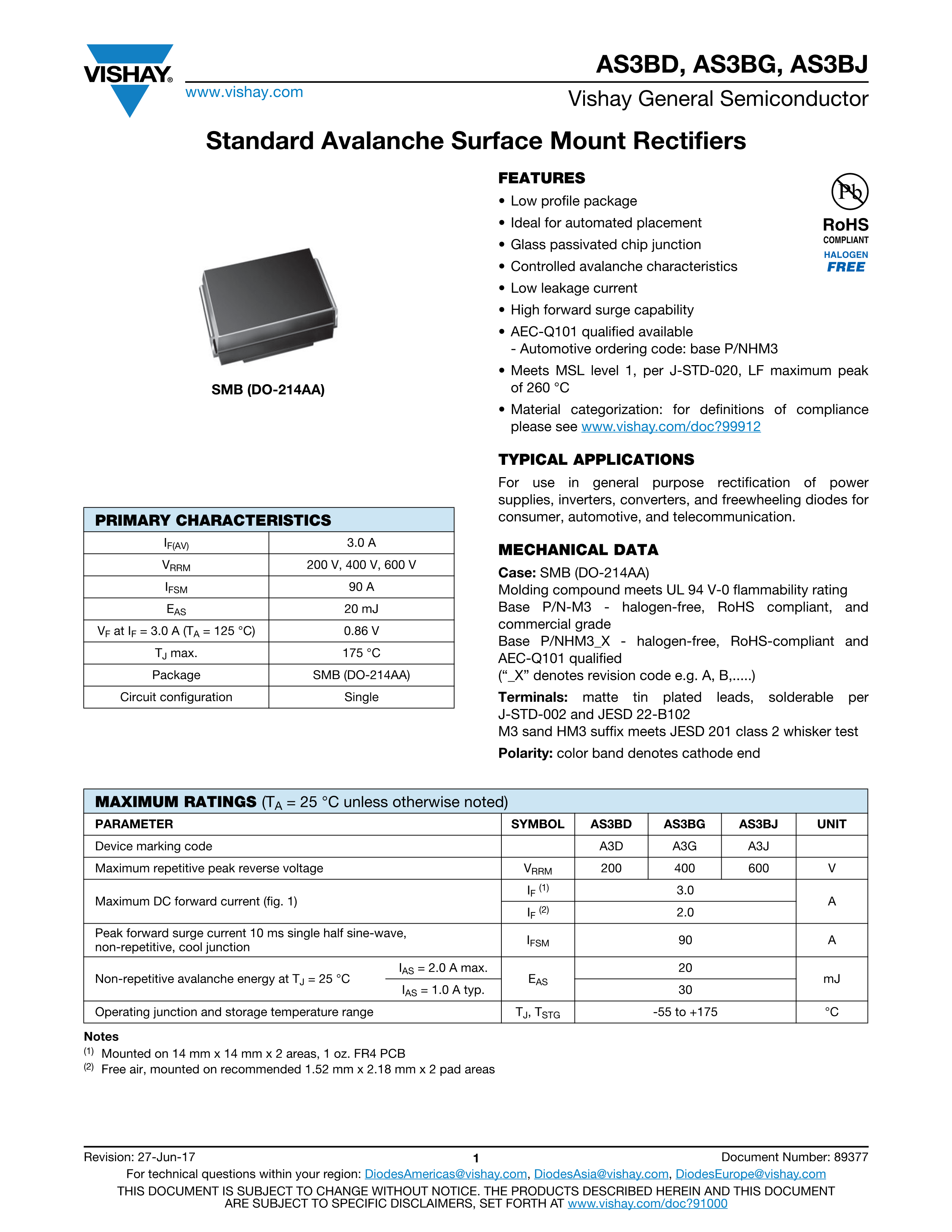 AS3BJ-M3-52T数据手册SMB(DO-214AA)封装VISHAY(威世)PDF规格书,中英