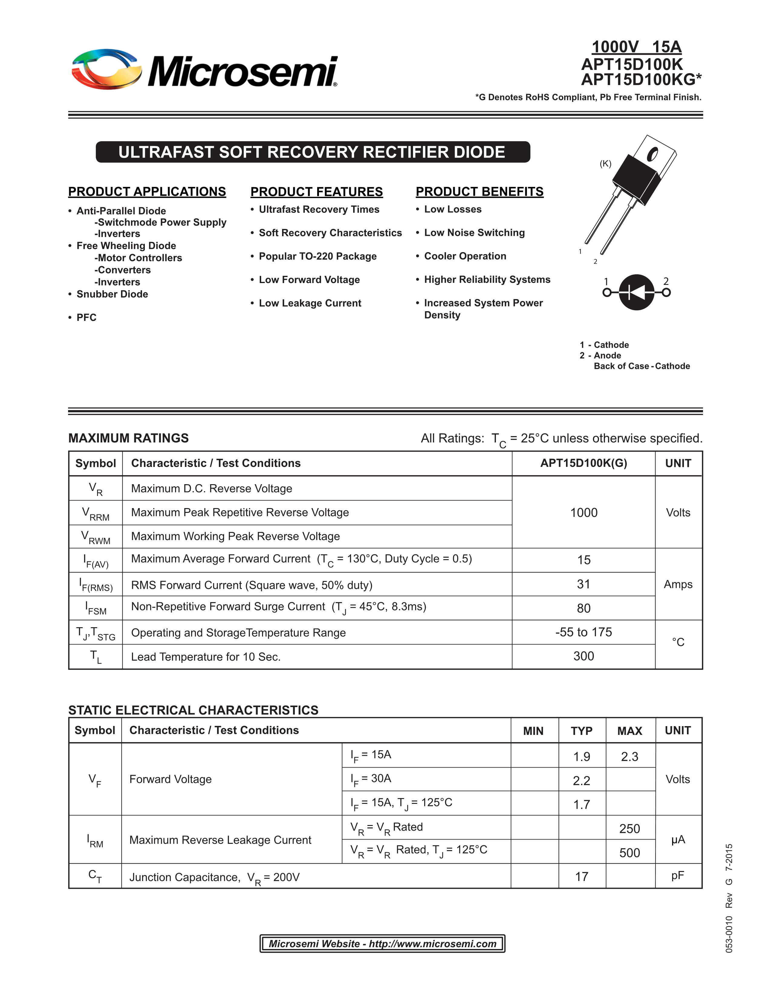 APT15D100KG数据手册TO-220-3封装MICROCHIP(美国微芯)PDF规格书,中英文