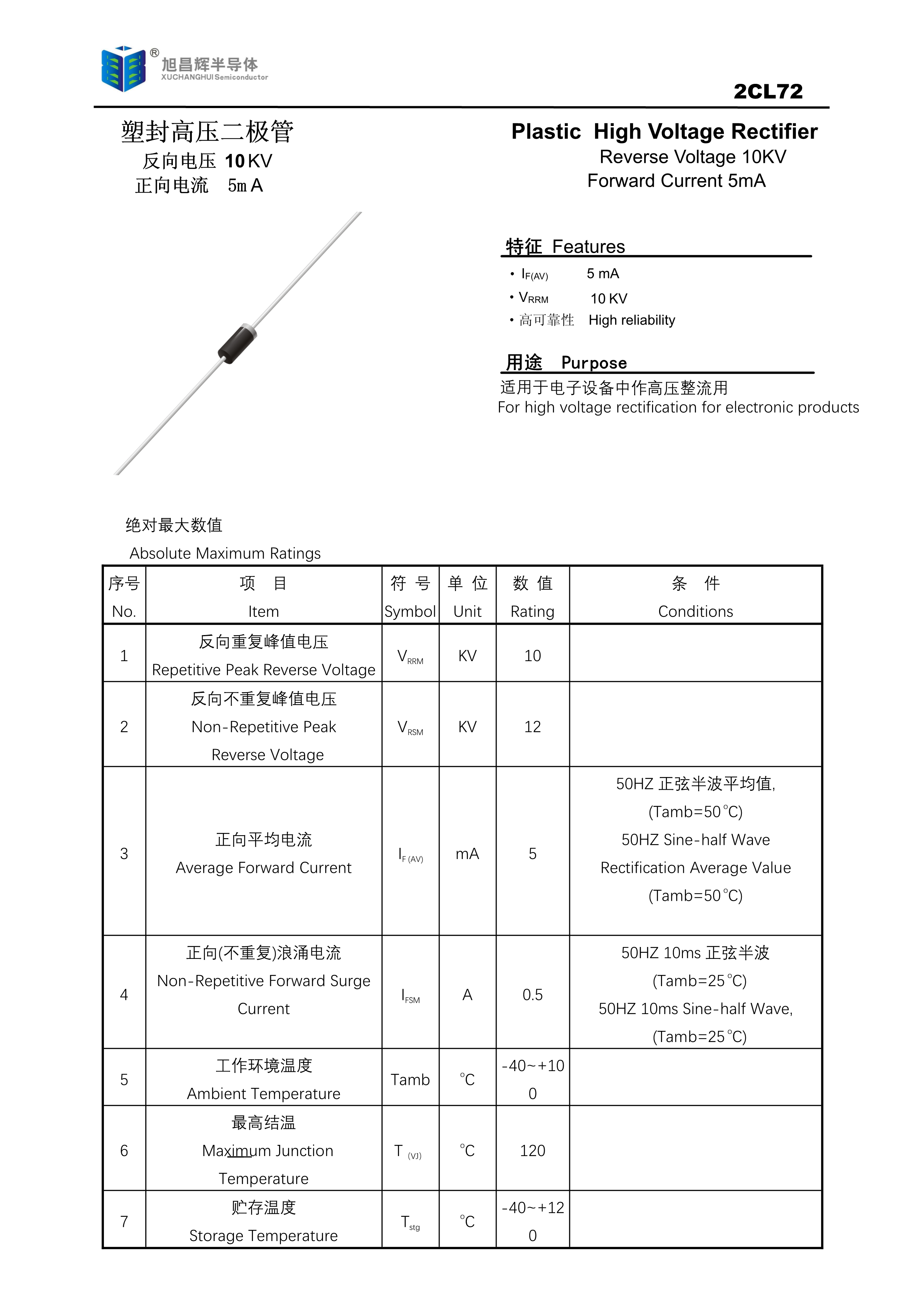 2CL72数据手册轴线引线封装XCH(旭昌辉)PDF规格书,中英文下载