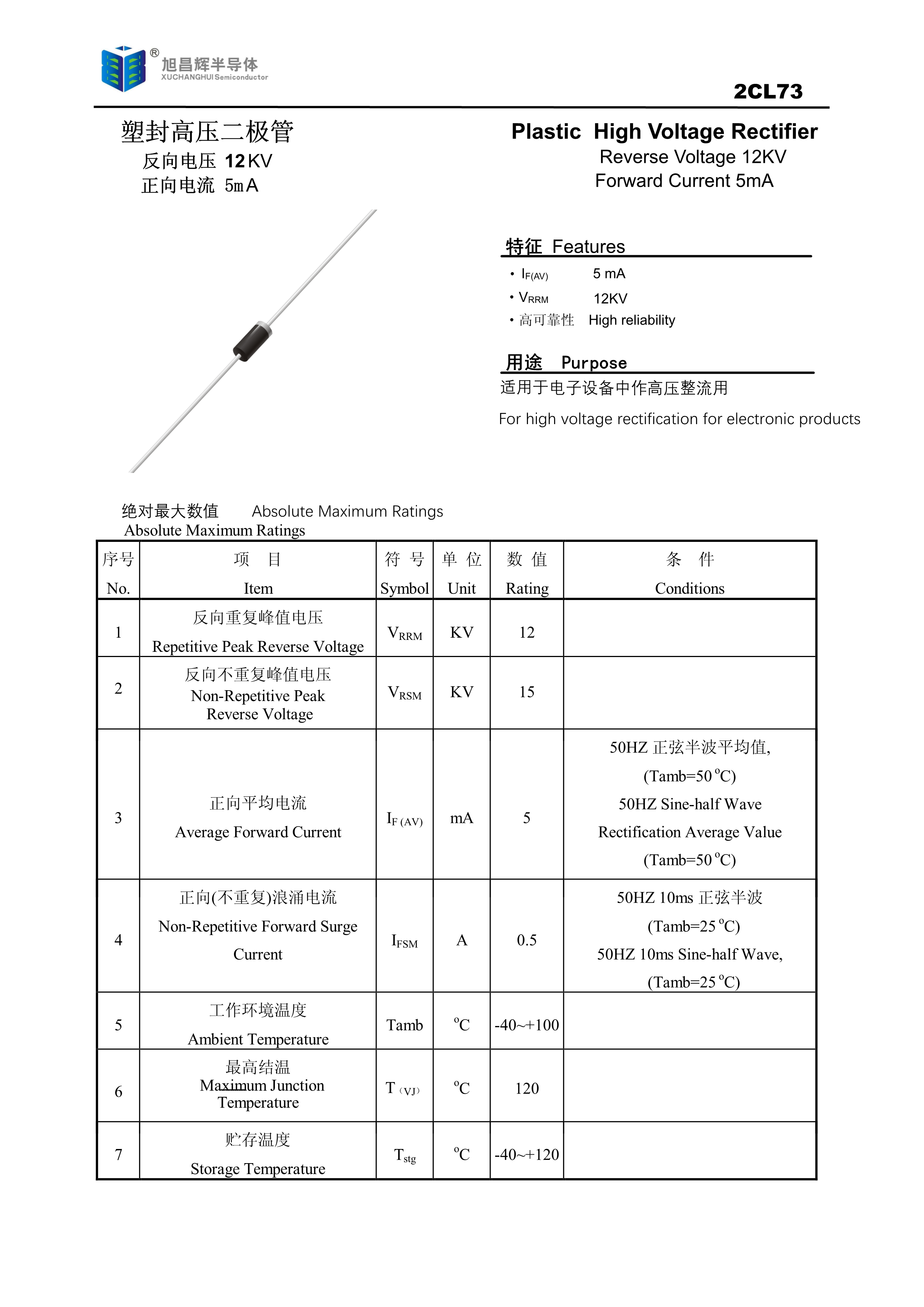 2CL73数据手册轴线引线封装XCH(旭昌辉)PDF规格书,中英文下载
