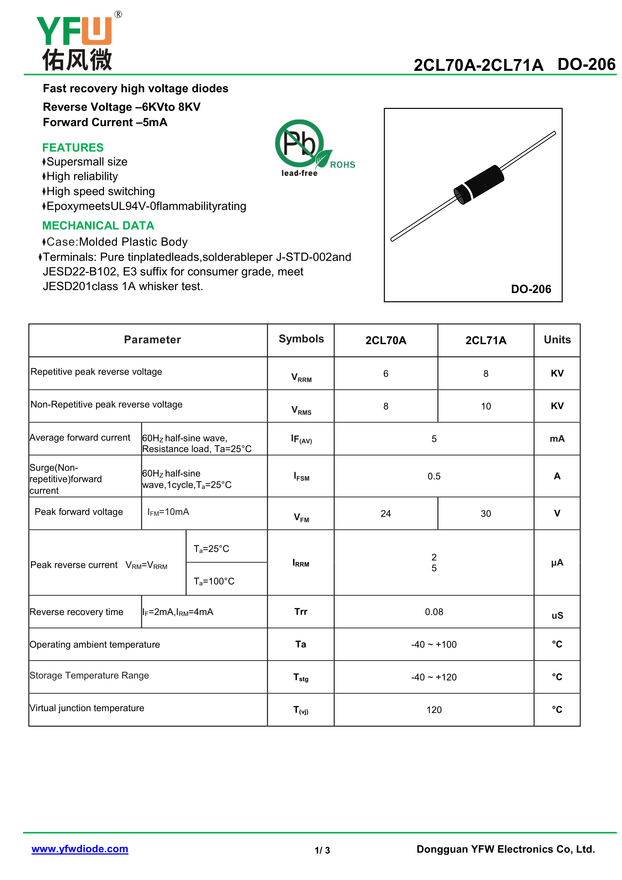 2CL71A数据手册DO-206封装YFW(佑风微)PDF规格书,中英文下载