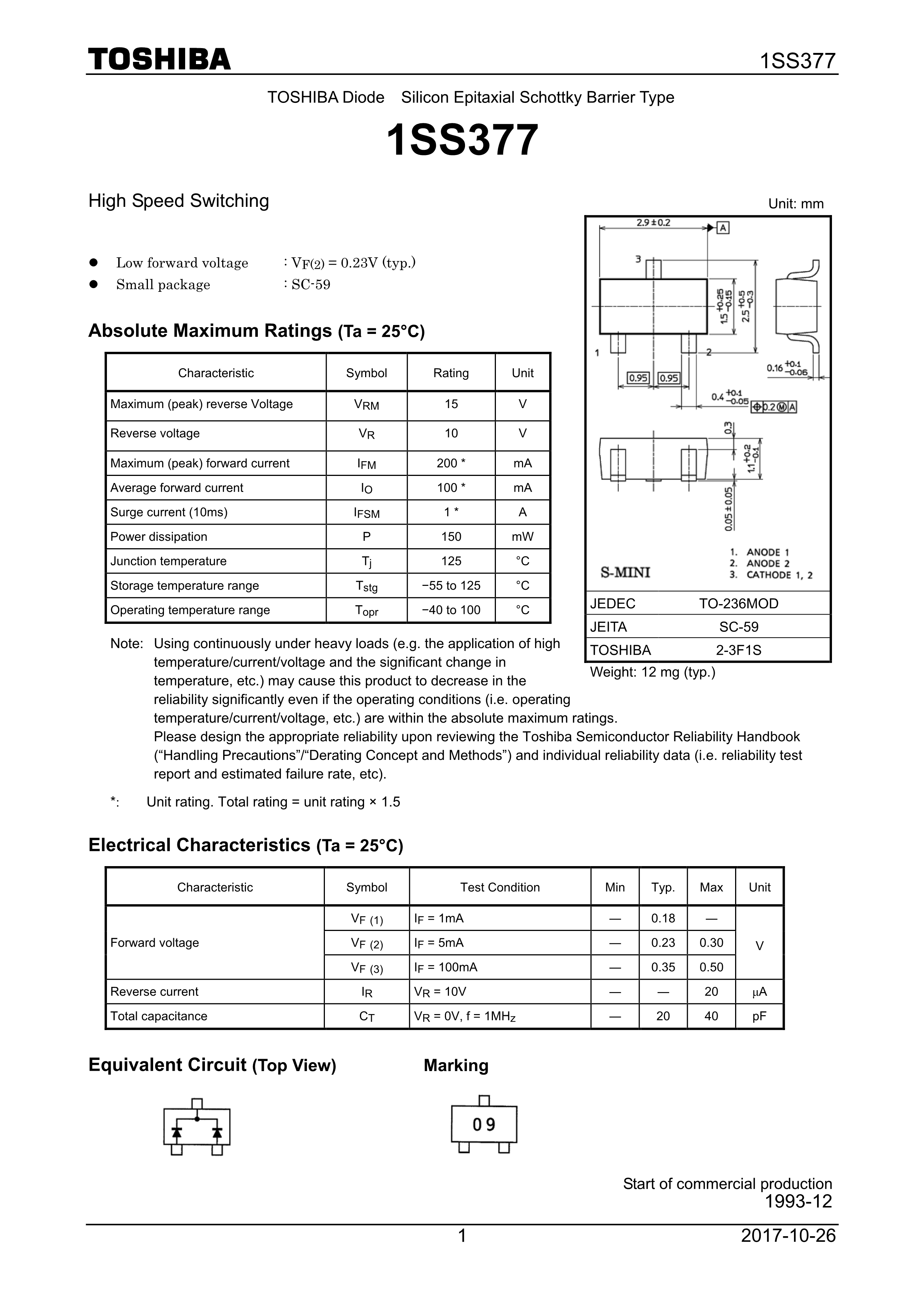 1SS377(TE85LF)数据手册SOT-23(SOT-23-3)封装TOSHIBA(东芝)PDF