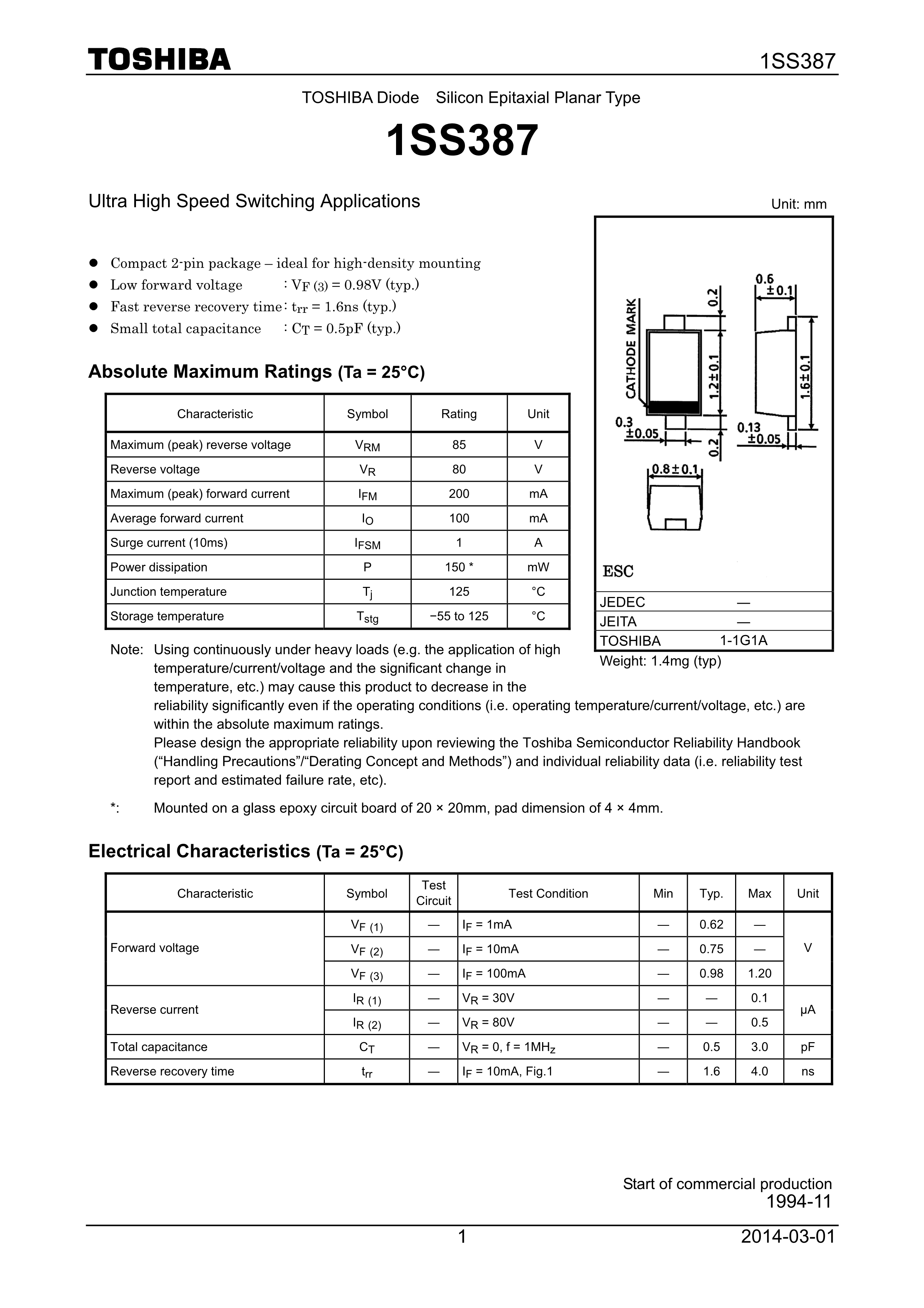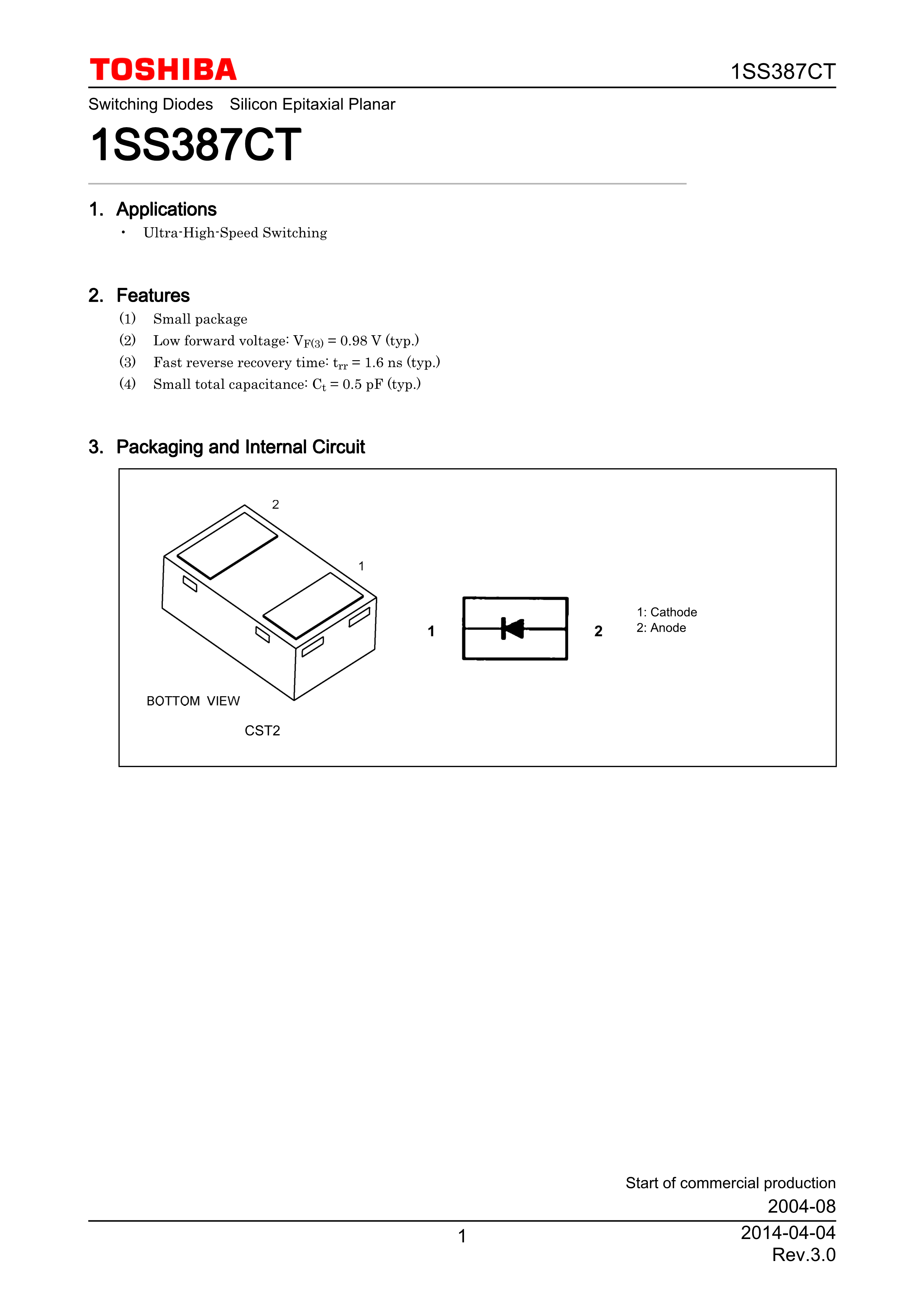1SS387CTL3F数据手册SOD-882封装TOSHIBA(东芝)PDF规格书,中英文下载