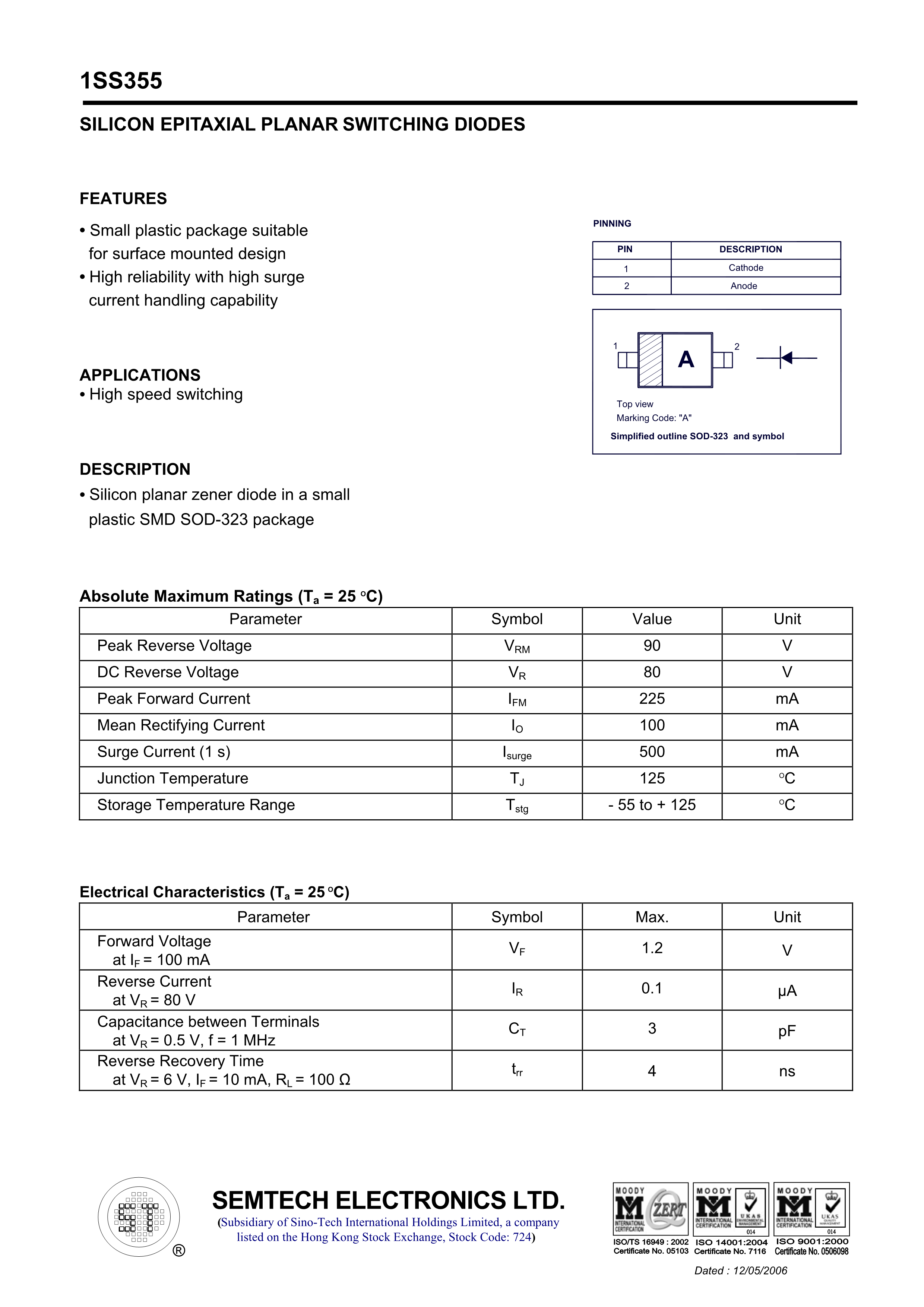 1SS355数据手册SOD-323封装ST(先科)PDF规格书,中英文下载