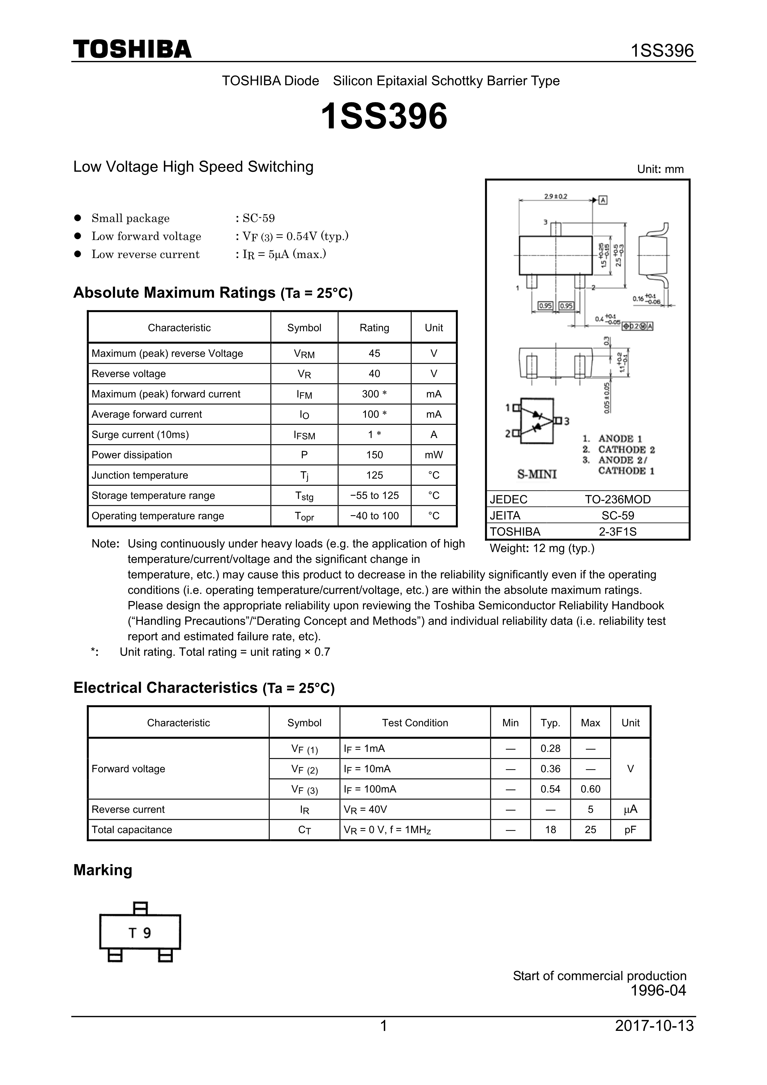 1SS396LF数据手册SC-59封装TOSHIBA(东芝)PDF规格书,中英文下载