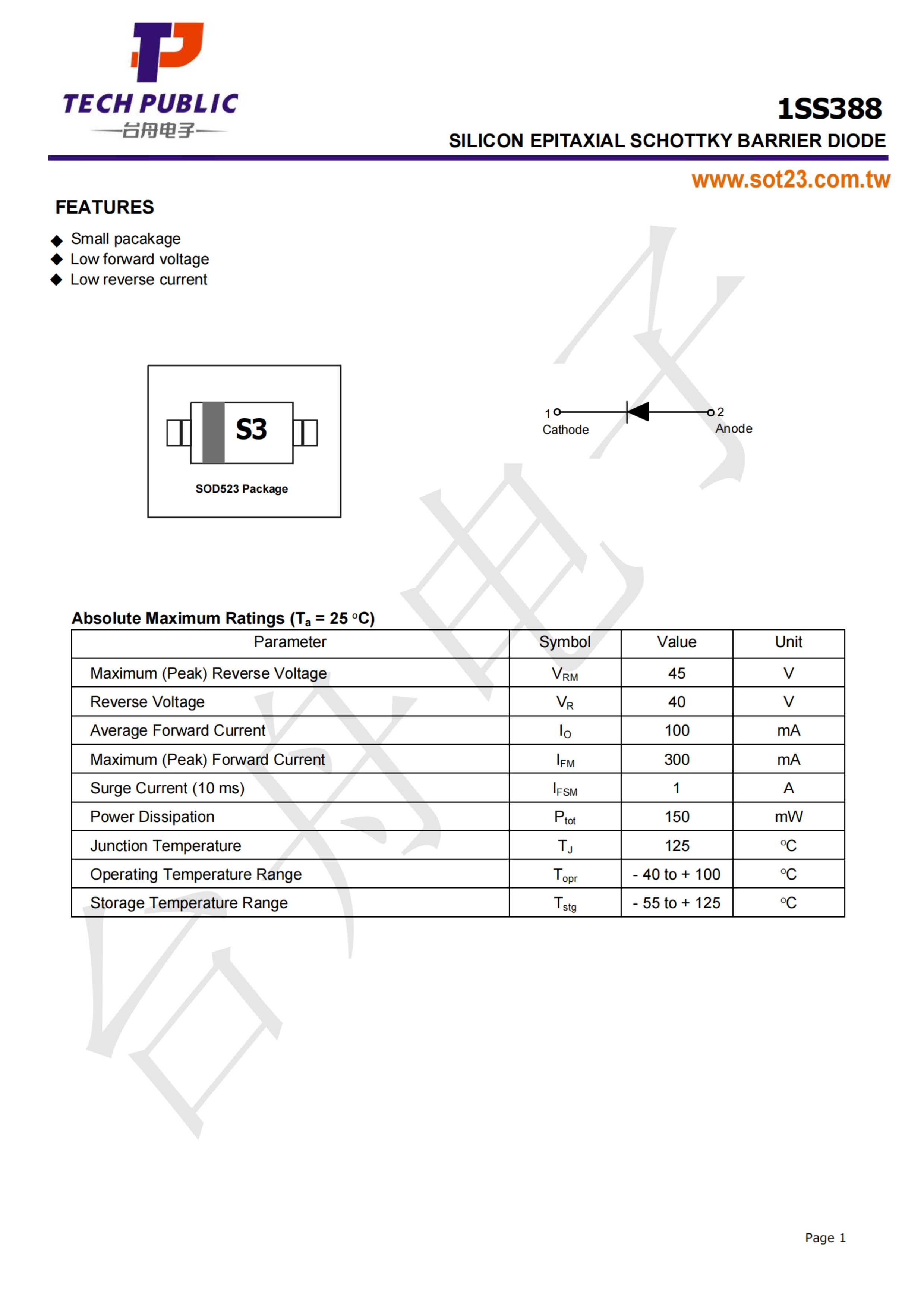 1SS388数据手册SOD-523封装TECH PUBLIC(台舟)PDF规格书,中英文下载