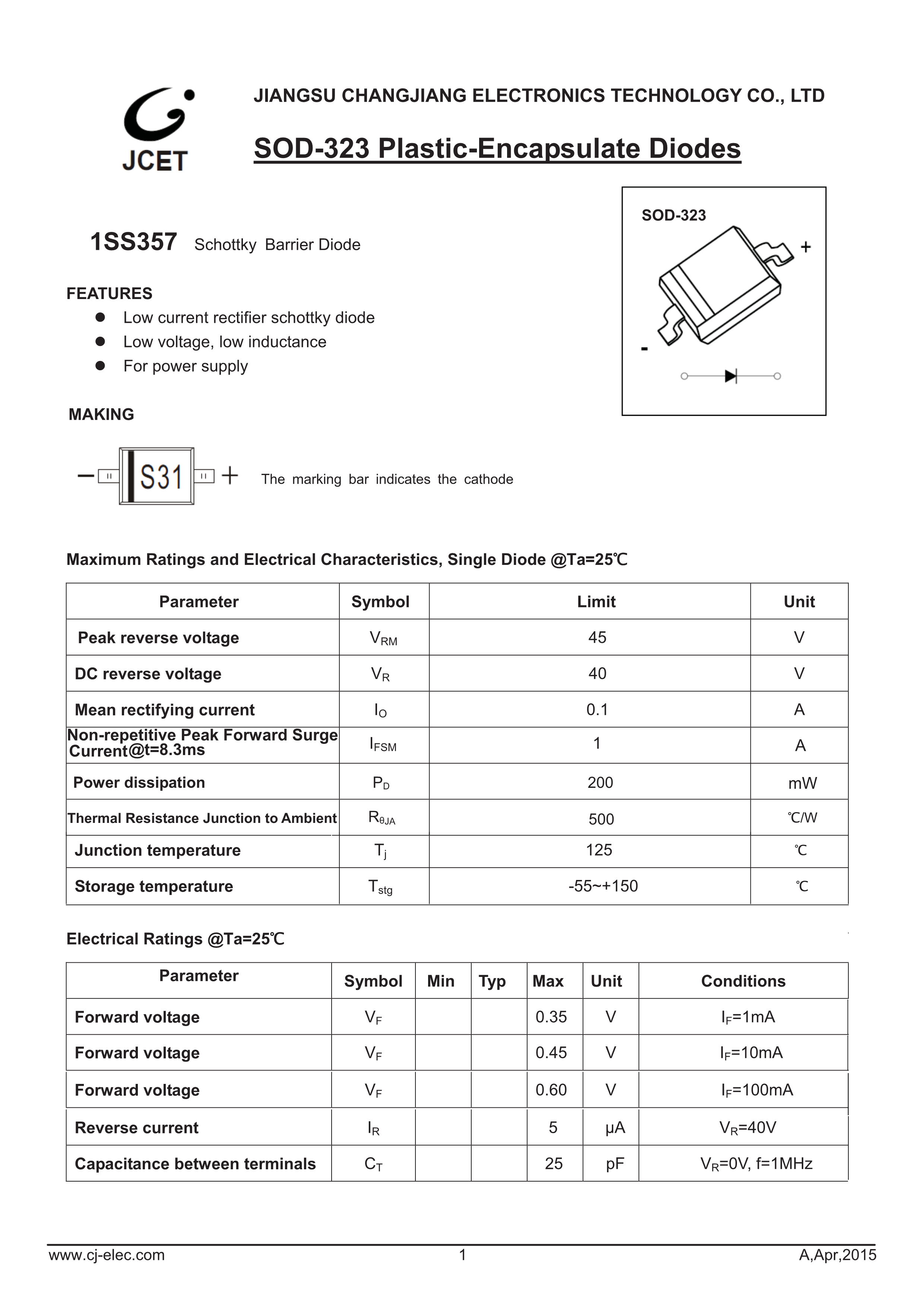 1SS357数据手册SOD-323封装CJ(江苏长电-长晶)PDF规格书,中英文下载