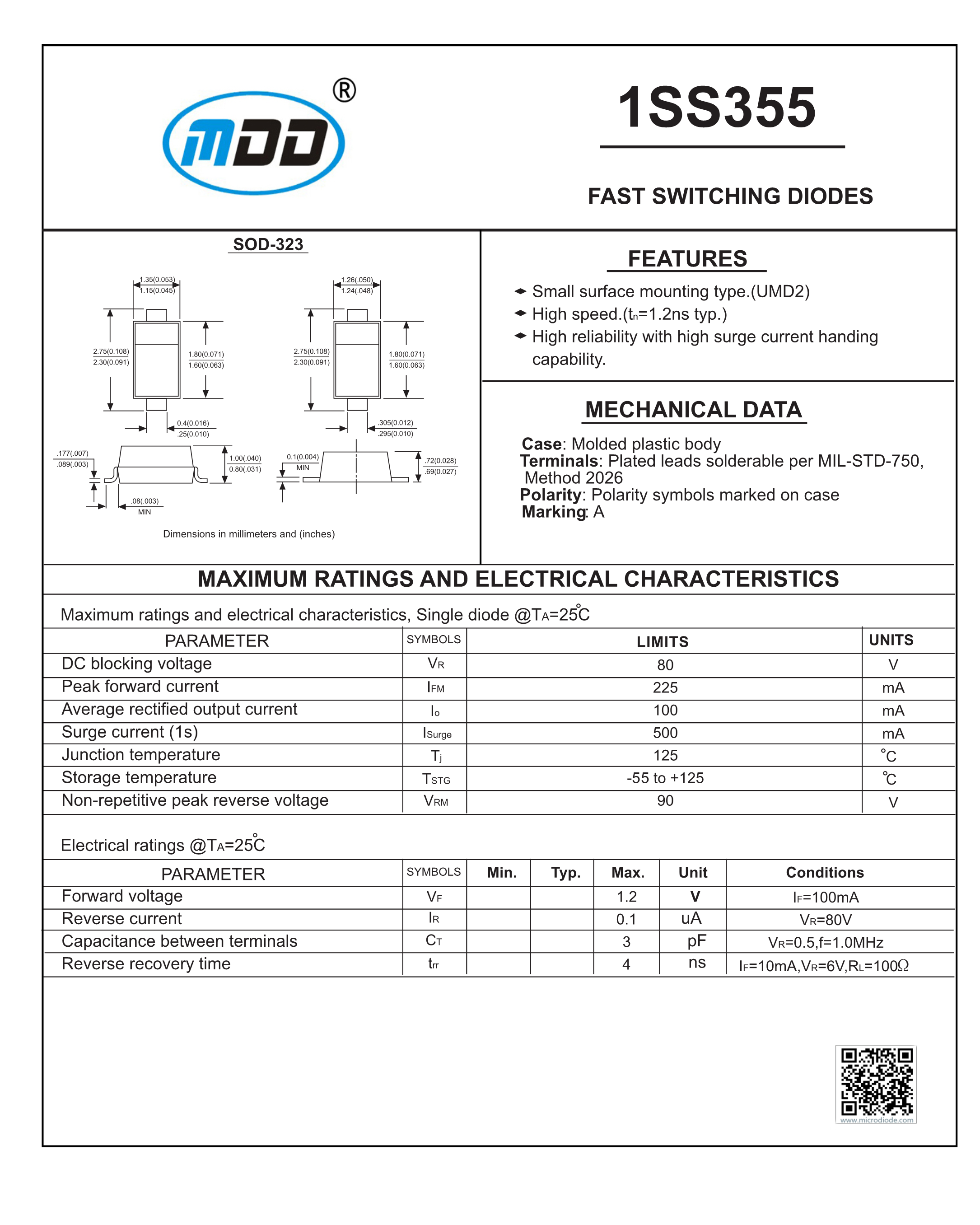 1SS355数据手册SOD-323封装MDDPDF规格书,中英文下载