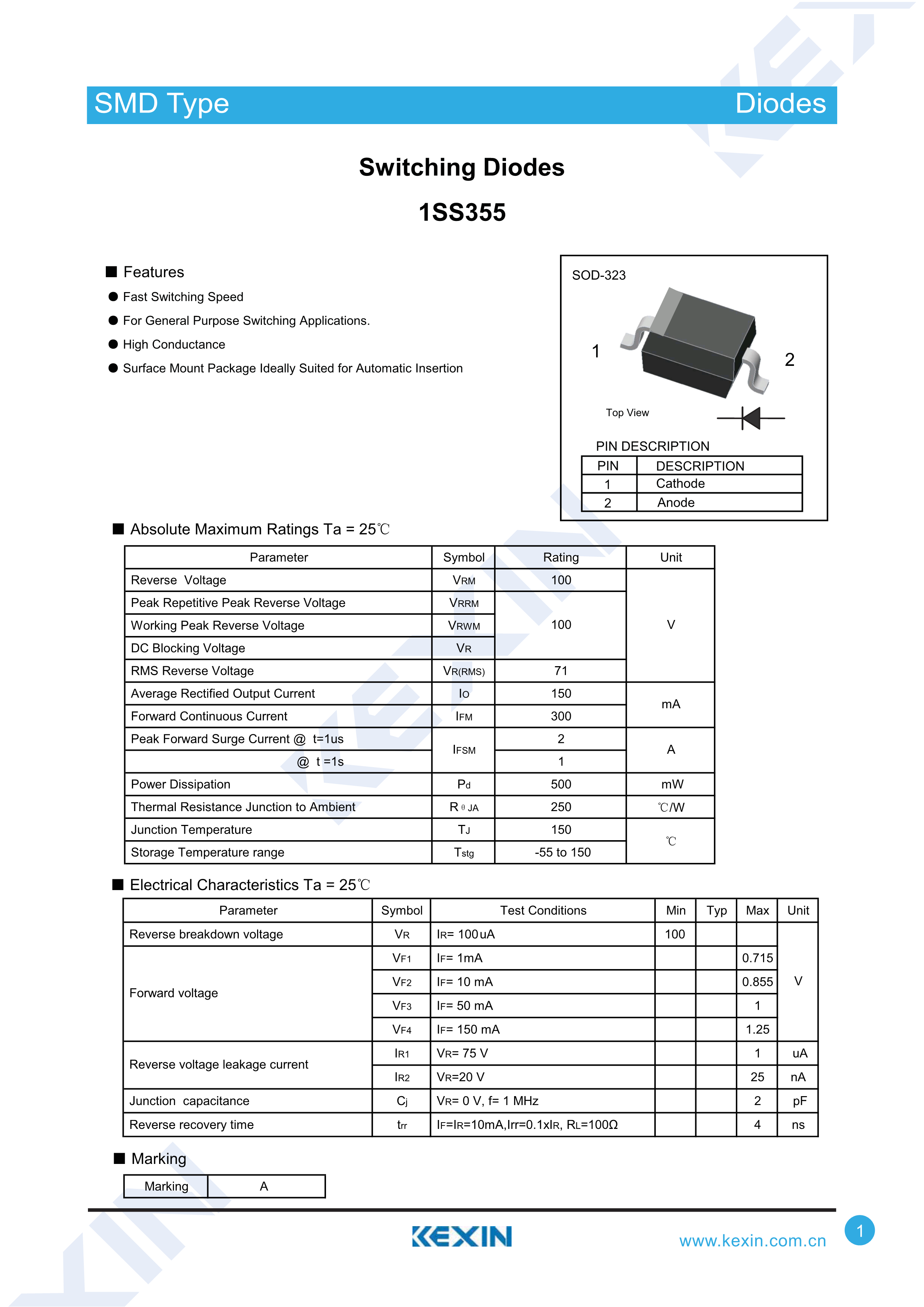 1SS355数据手册SOD-323封装KEXIN(科信)PDF规格书,中英文下载
