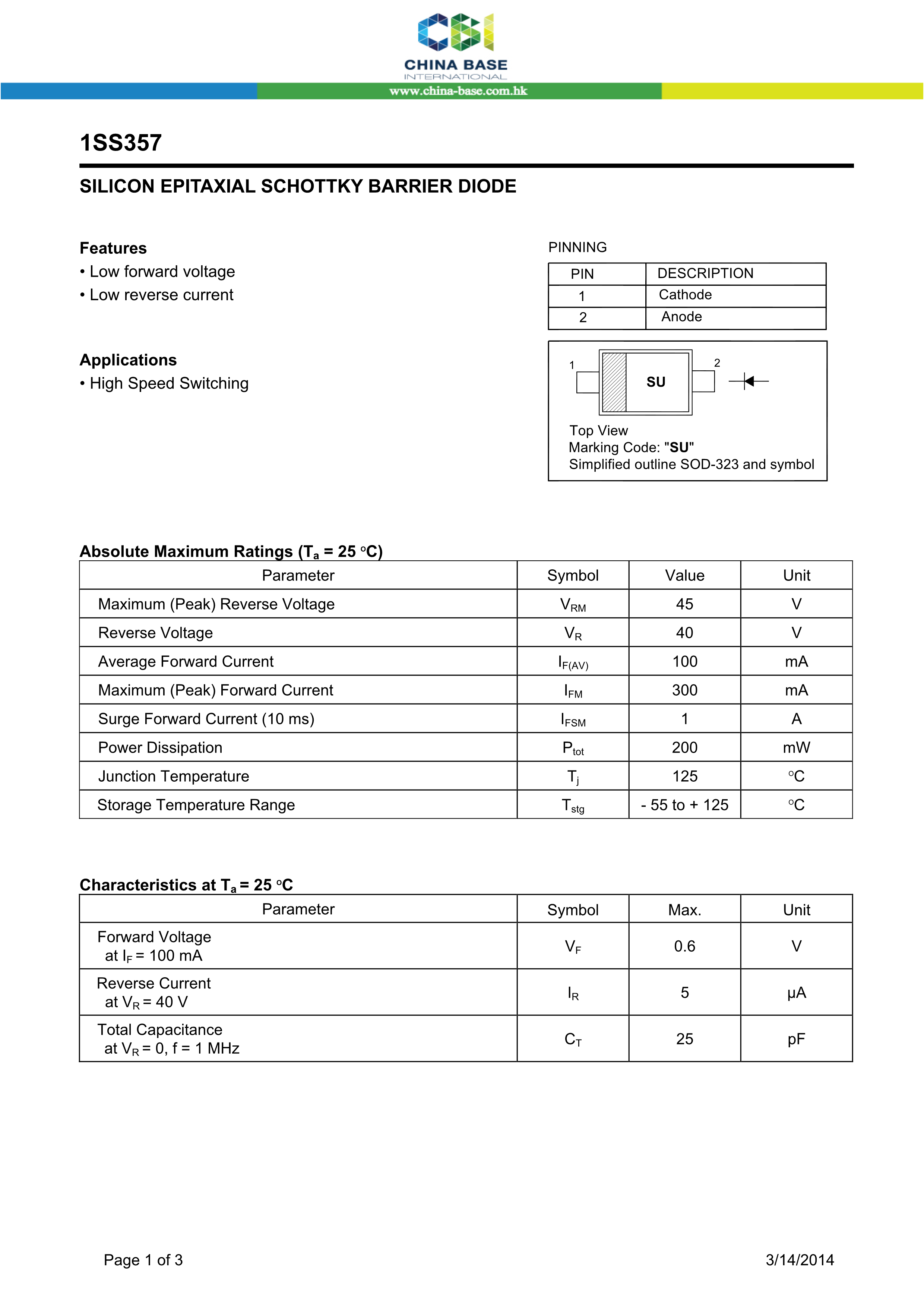 1SS357 SU数据手册SOD-323封装CBI(创基)PDF规格书,中英文下载