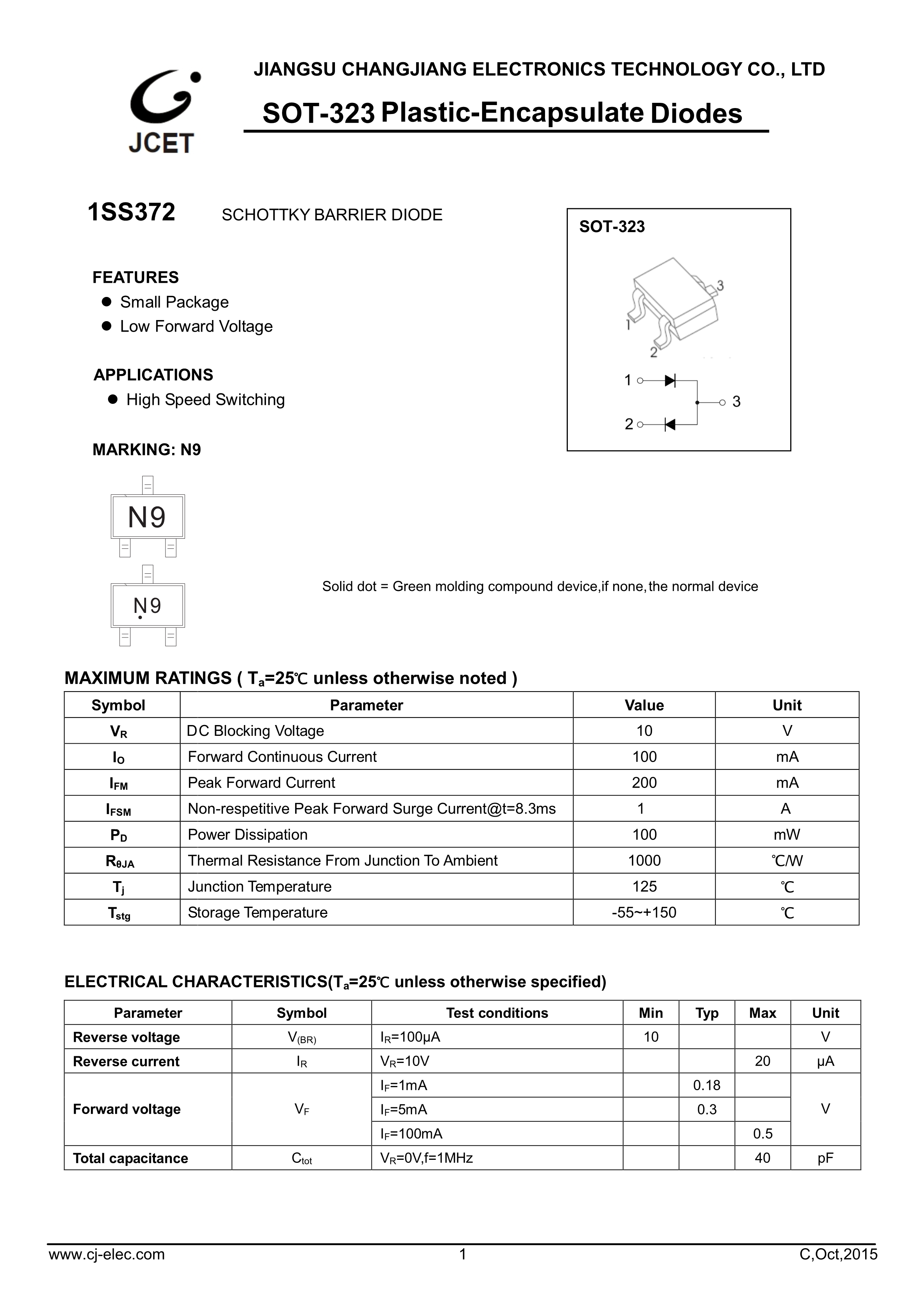1SS372数据手册SOT-323封装CJ(江苏长电-长晶)PDF规格书,中英文下载