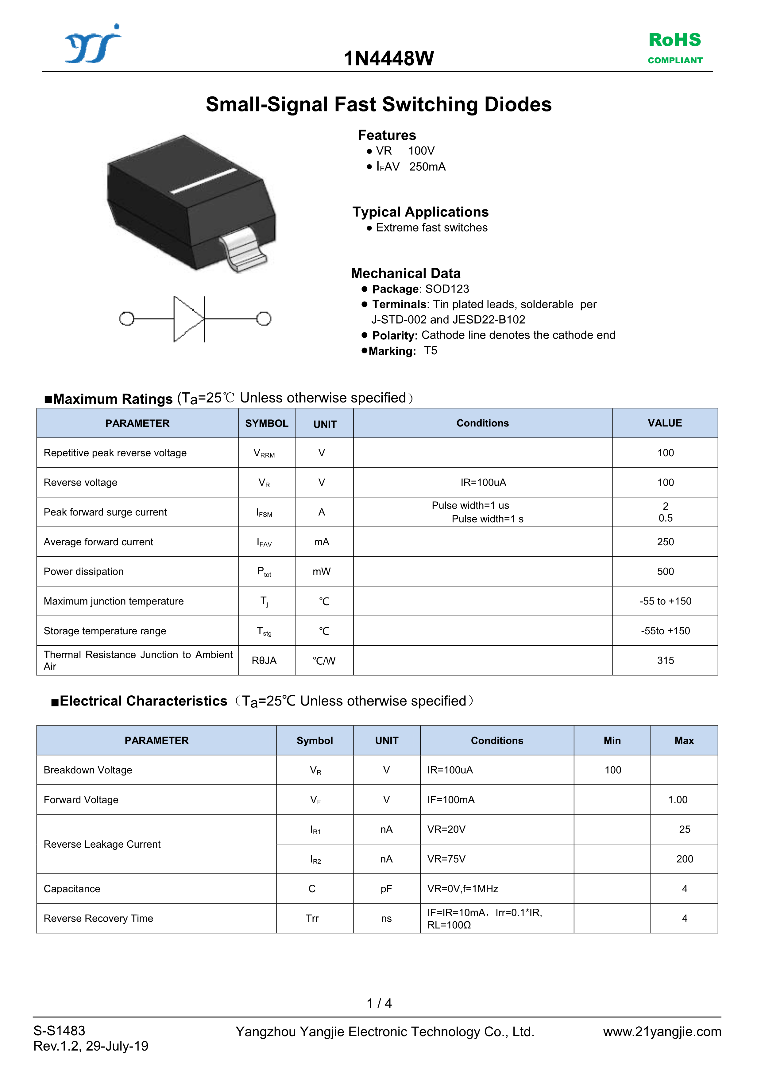 1N4448W数据手册SOD-123封装YANGJIE(扬杰)PDF规格书,中英文下载