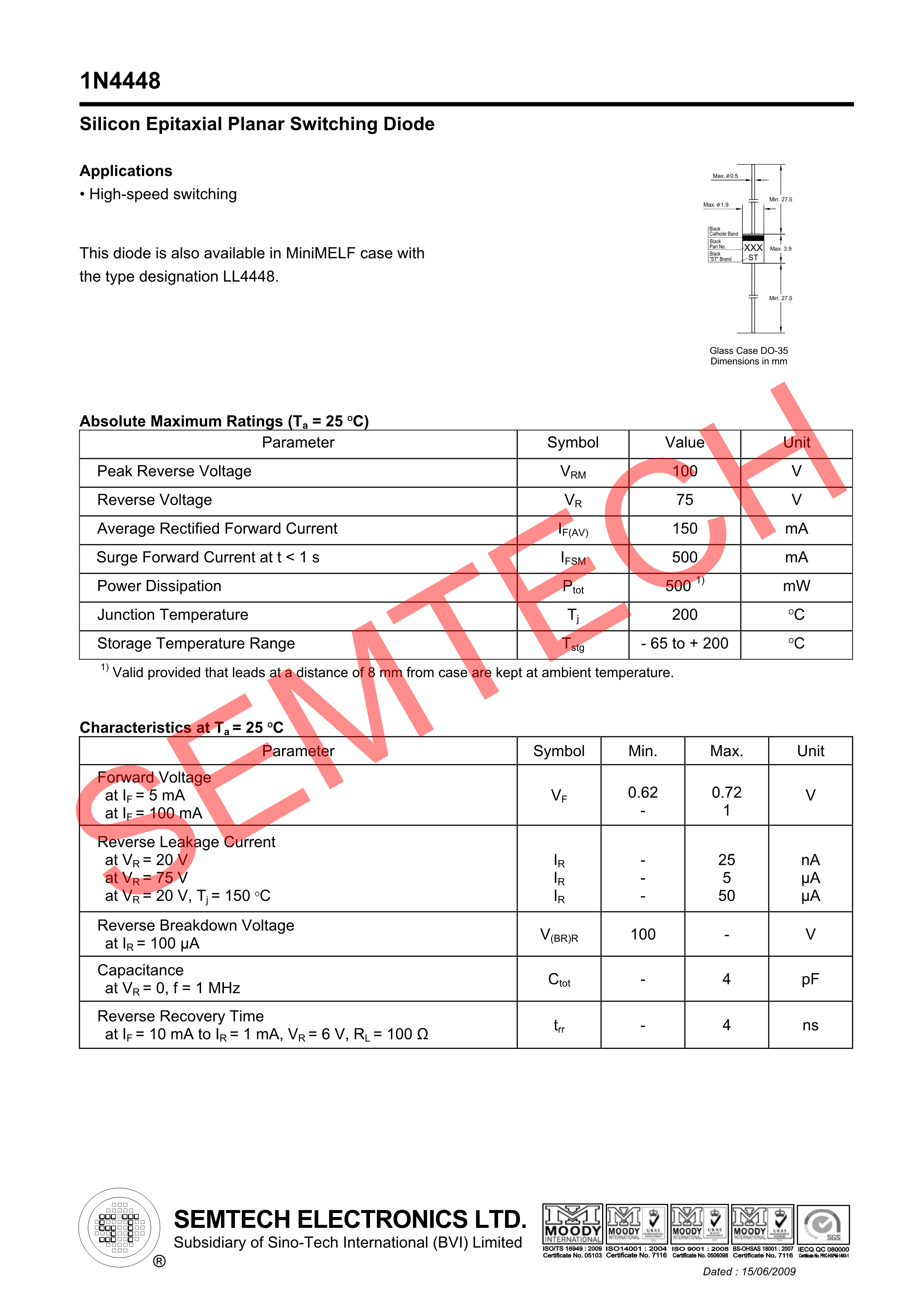 1N4448数据手册DO-35封装ST(先科)PDF规格书,中英文下载