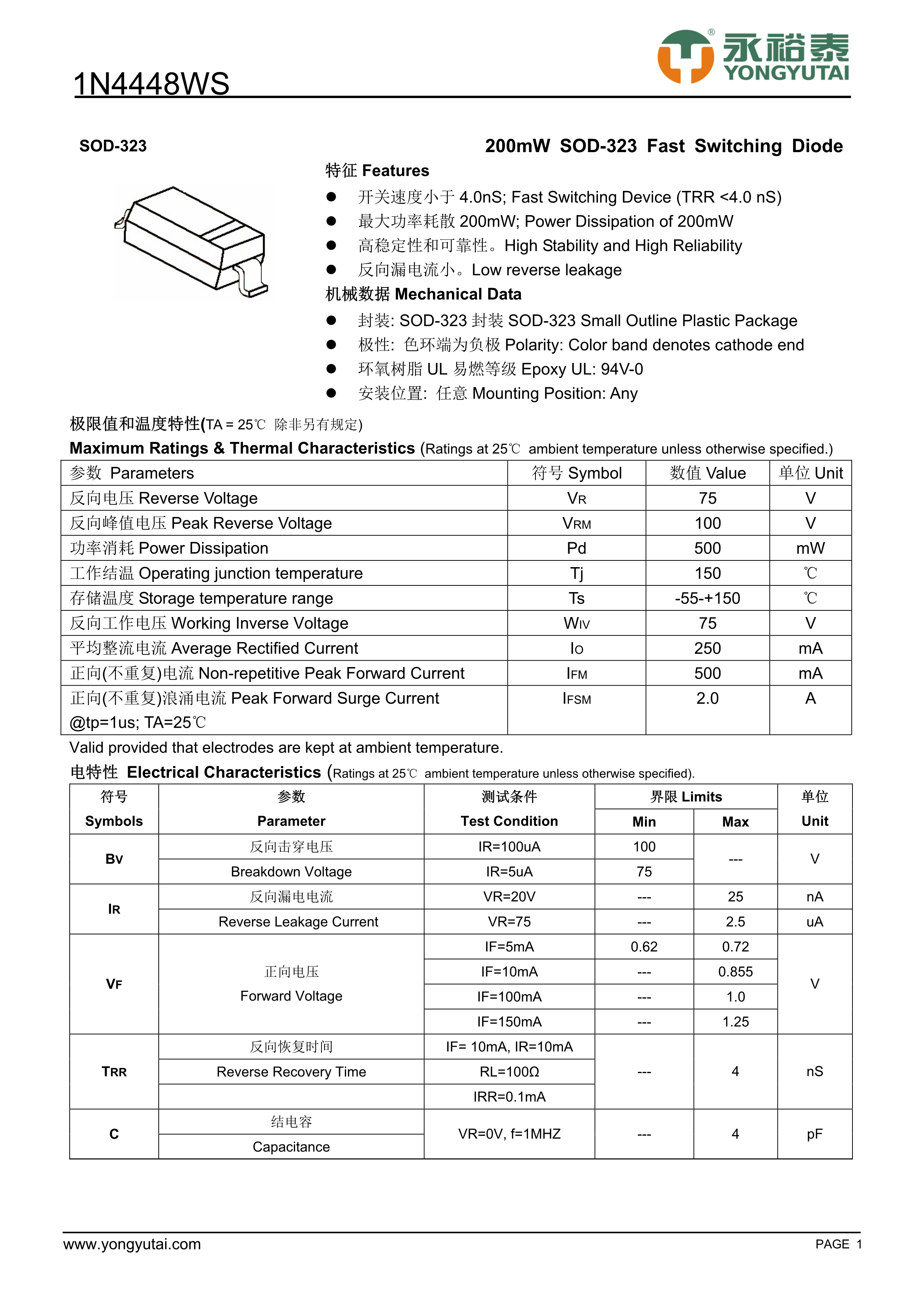 1N4448WS数据手册SOD-323封装YONGYUTAI(永裕泰)PDF规格书,中英文下载