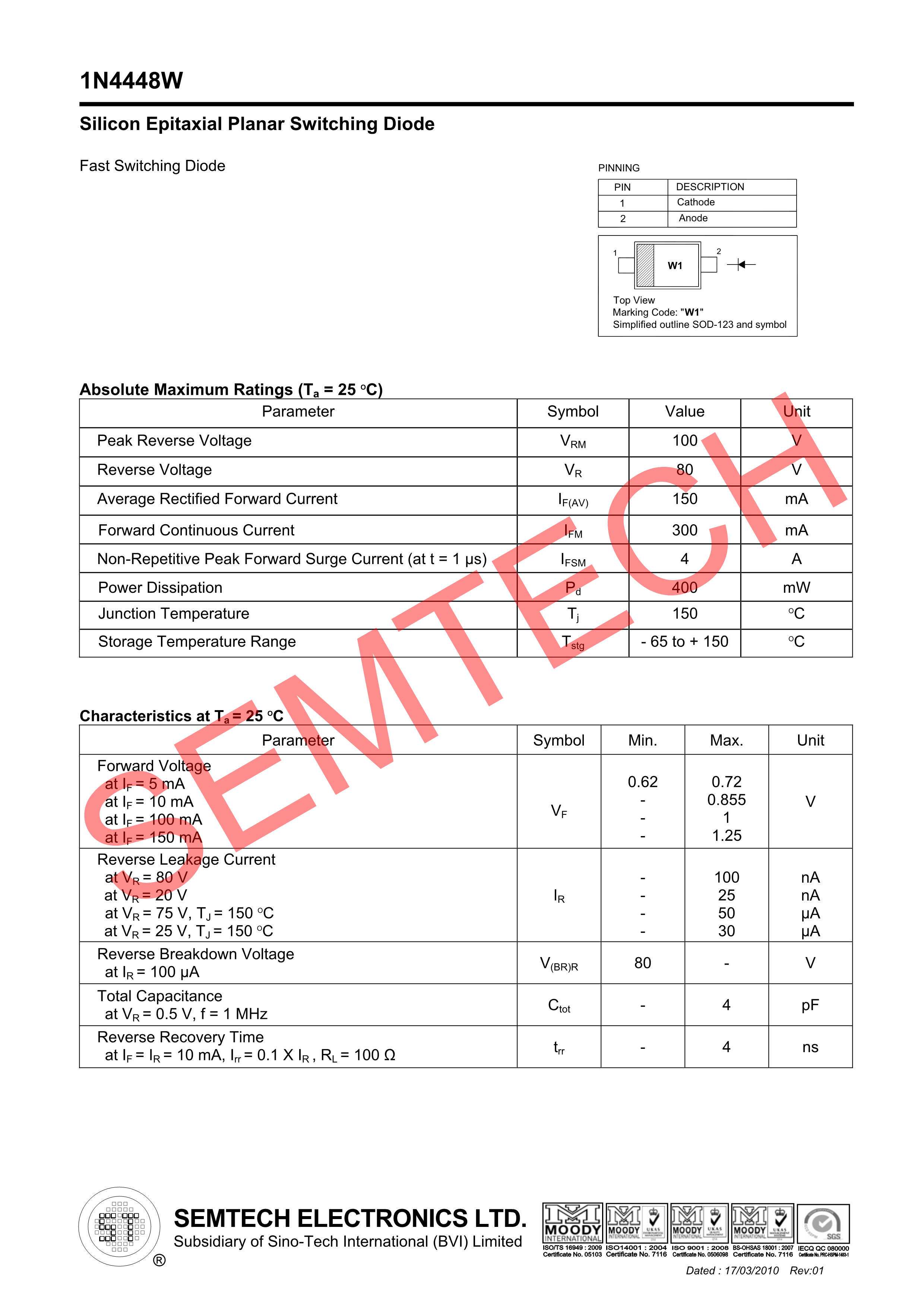 1N4448W数据手册SOD-123封装ST(先科)PDF规格书,中英文下载