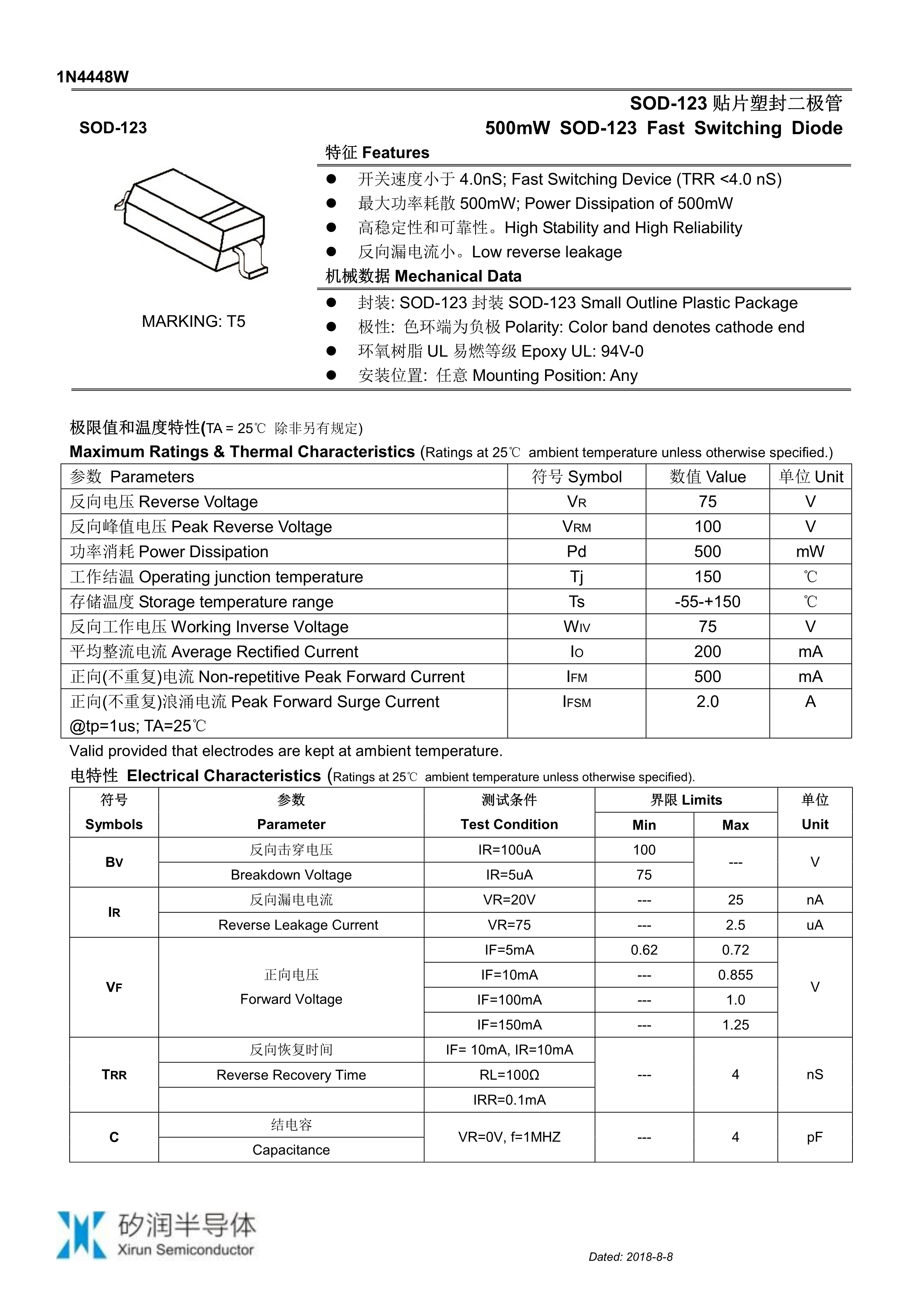 1N4448W-T5数据手册SOD-123封装ZRE(治润)PDF规格书,中英文下载