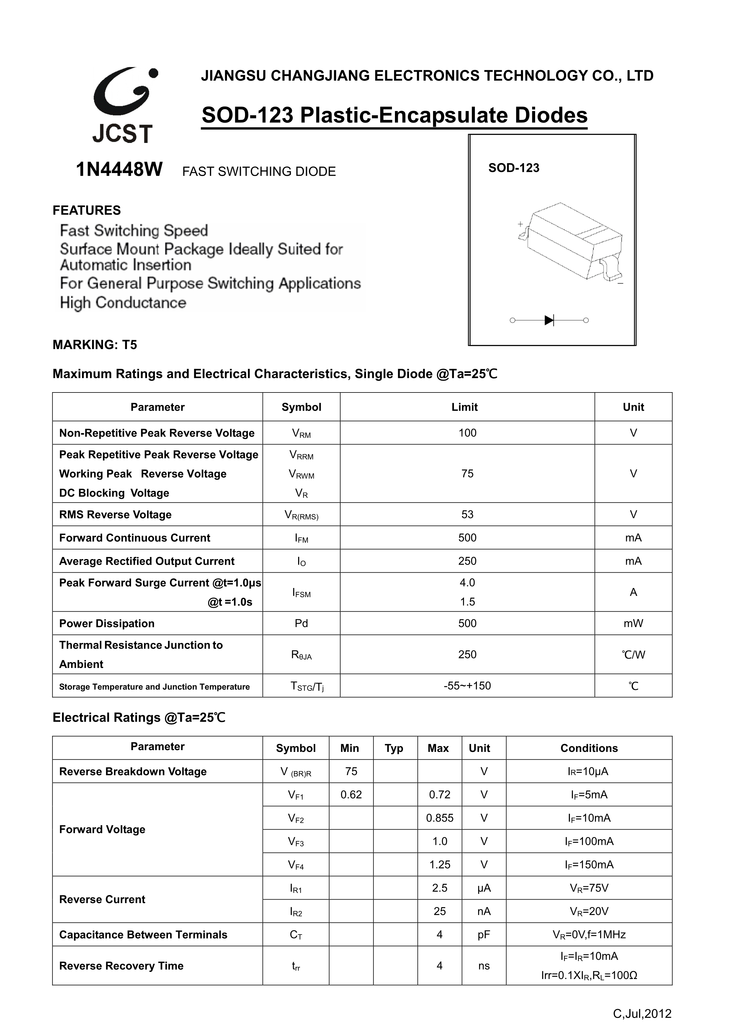 1N4448W数据手册SOD-123封装CJ(江苏长电-长晶)PDF规格书,中英文下载