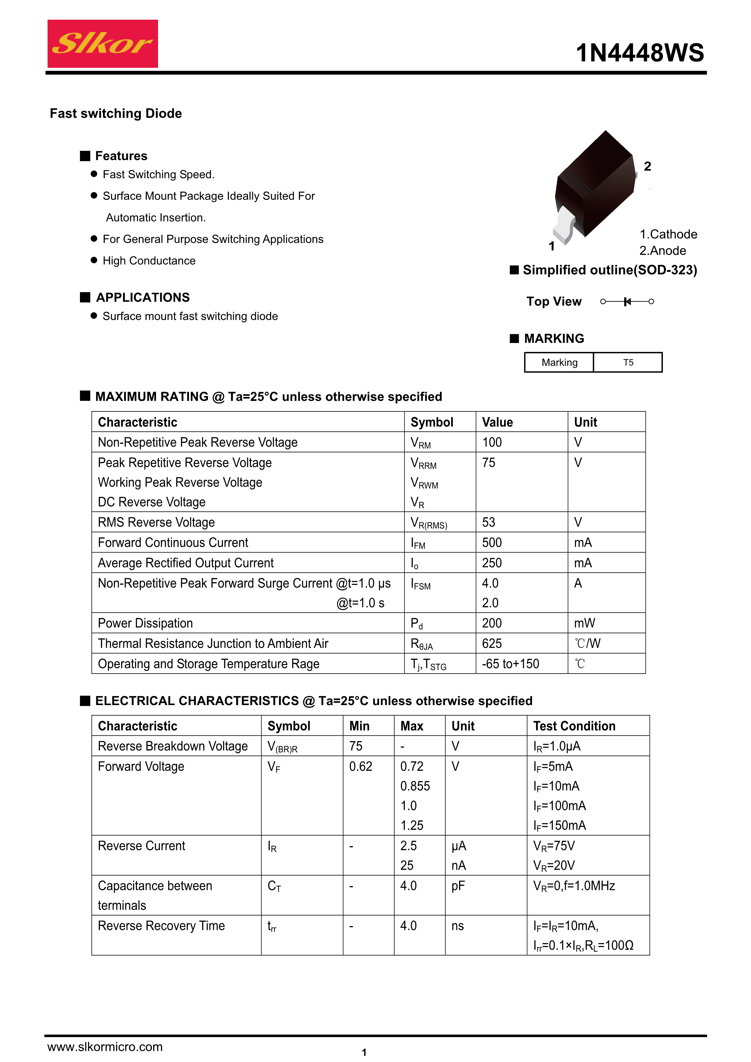 1N4448WS数据手册SOD-323封装Slkor(萨科微)PDF规格书,中英文下载