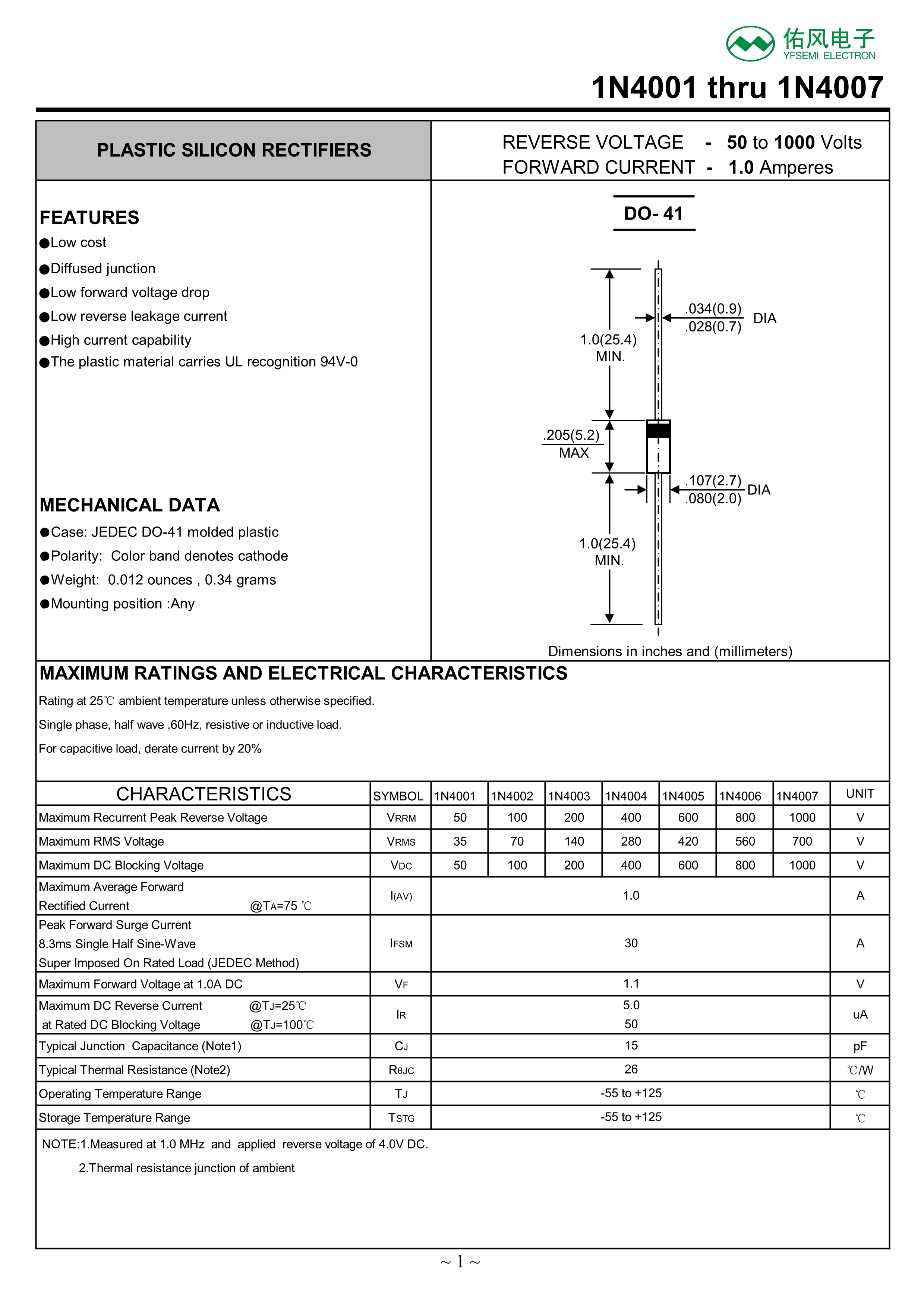 1N4007数据手册DO-41封装YFSEMI(江苏佑风微)PDF规格书,中英文下载