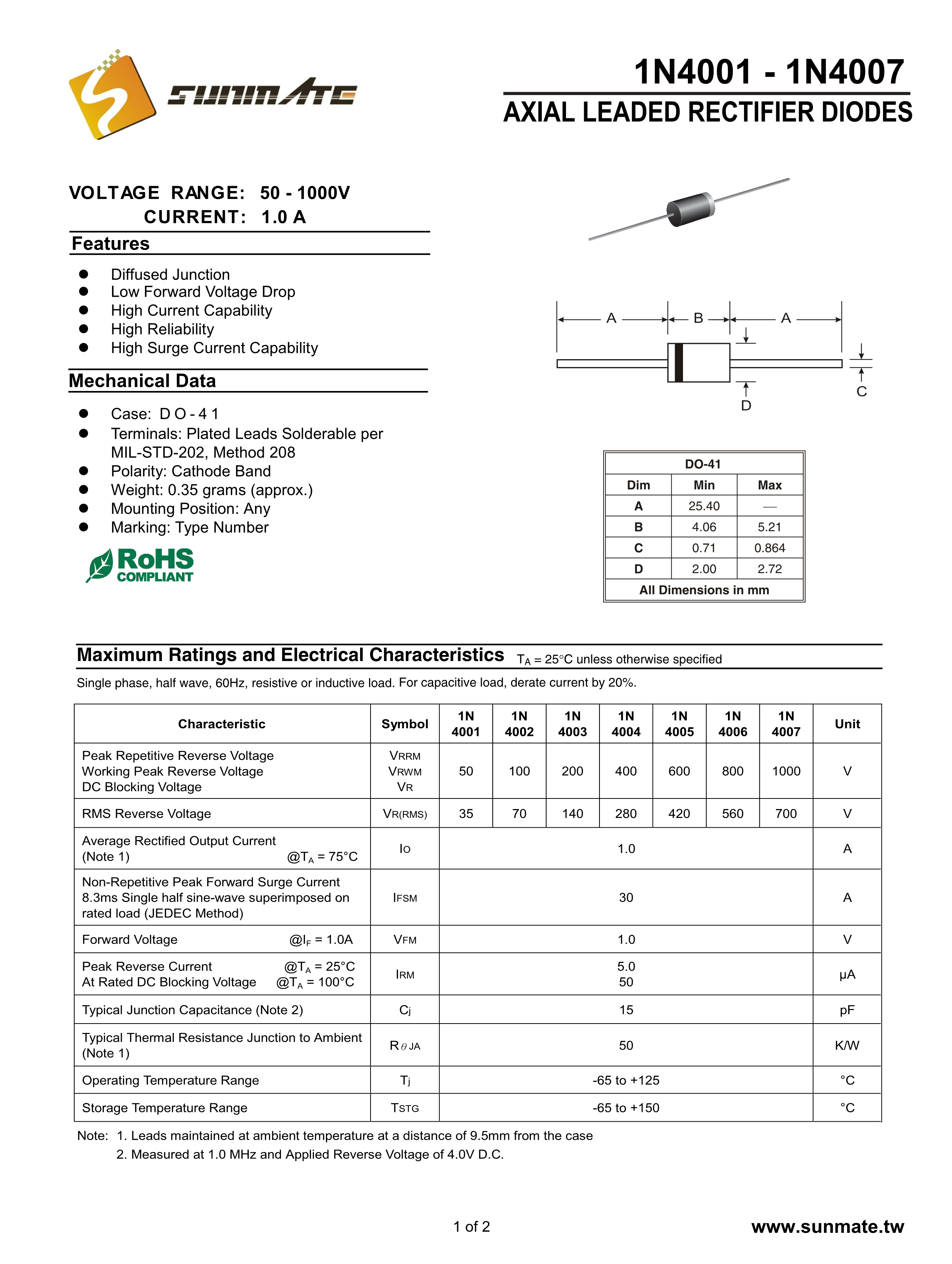 1N4007数据手册DO-41封装SUNMATE(森美特)PDF规格书,中英文下载