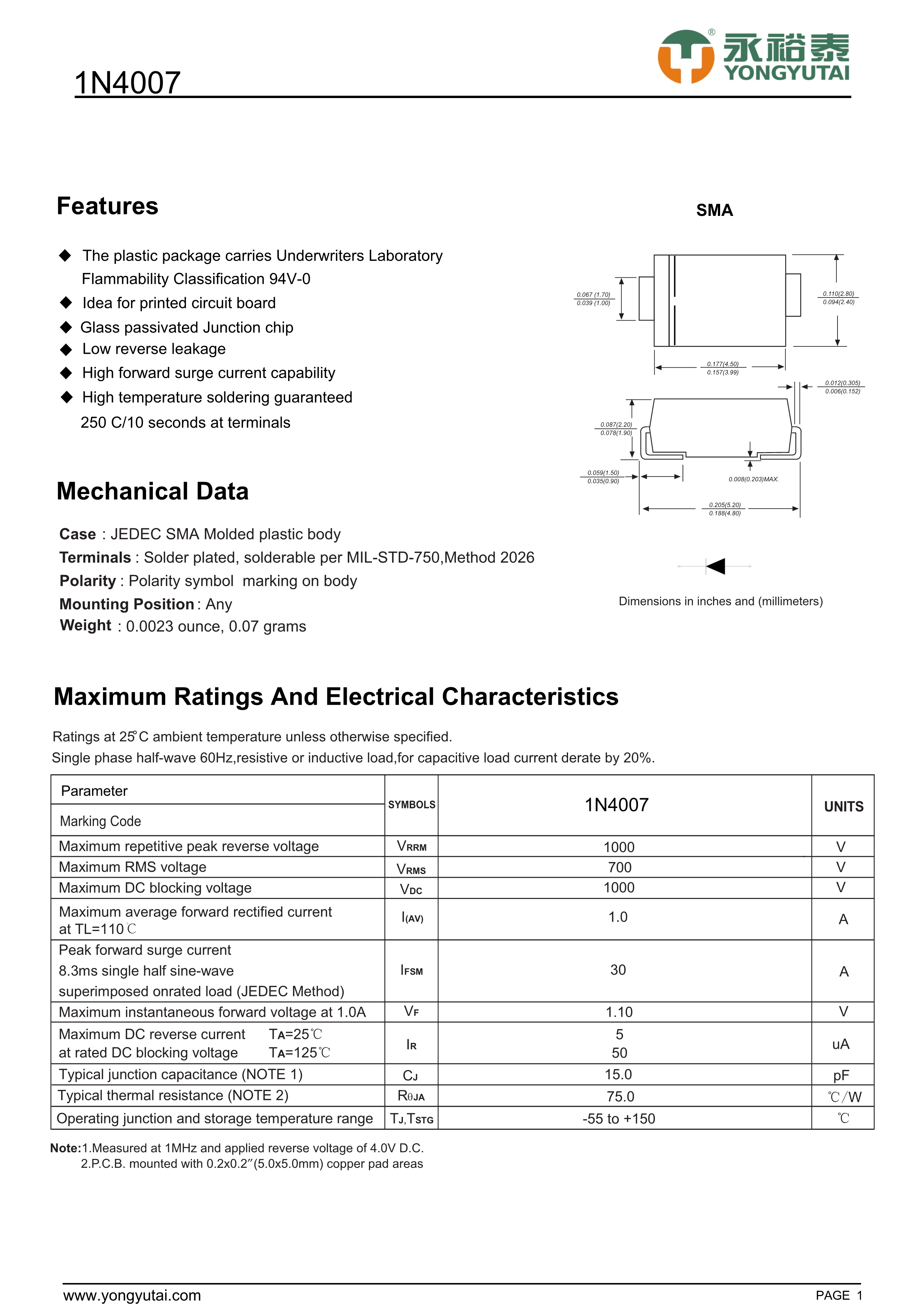 1N4007数据手册SMA封装YONGYUTAI(永裕泰)PDF规格书,中英文下载