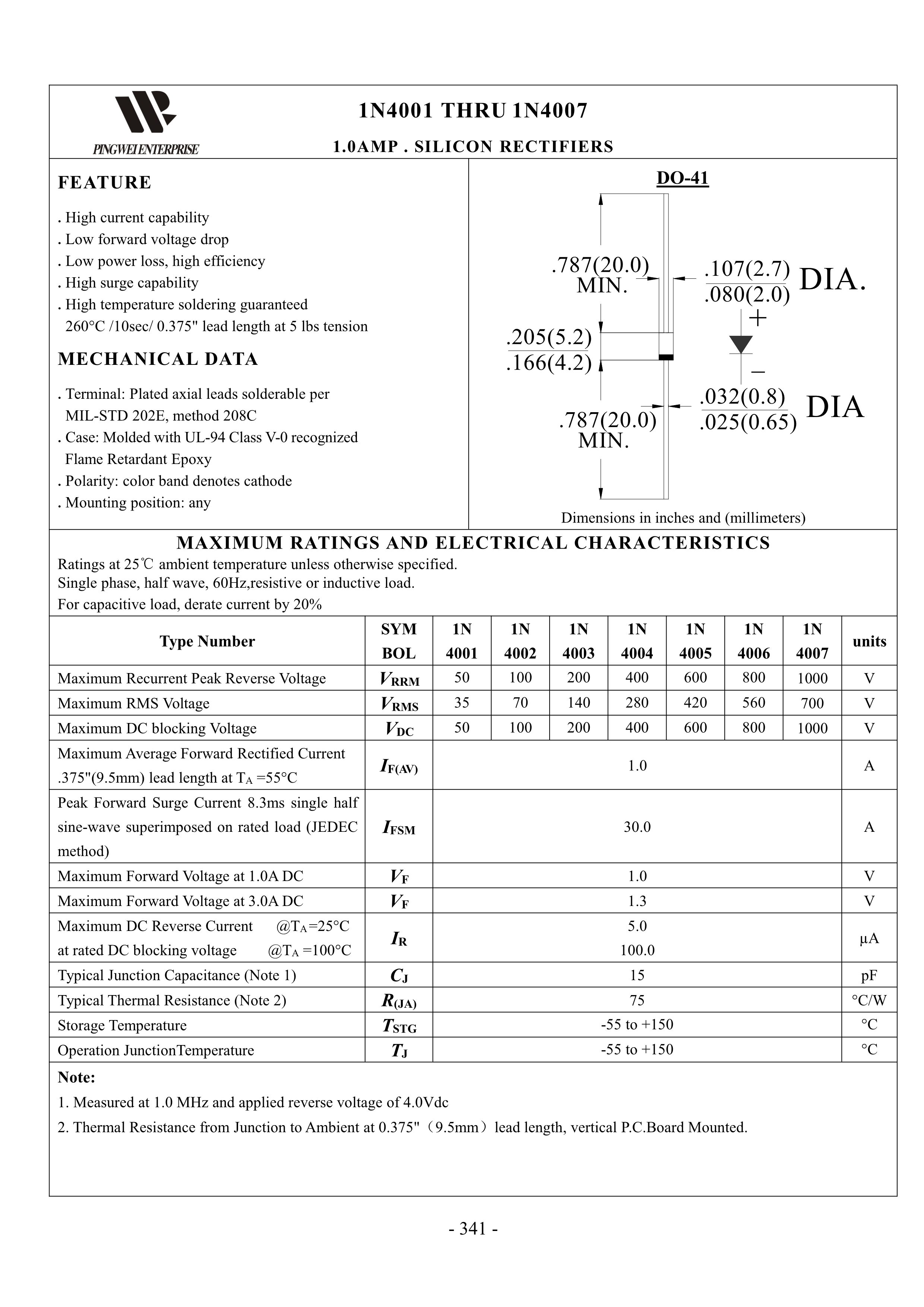 1N4007数据手册DO-41封装PINGWEI(平伟)PDF规格书,中英文下载