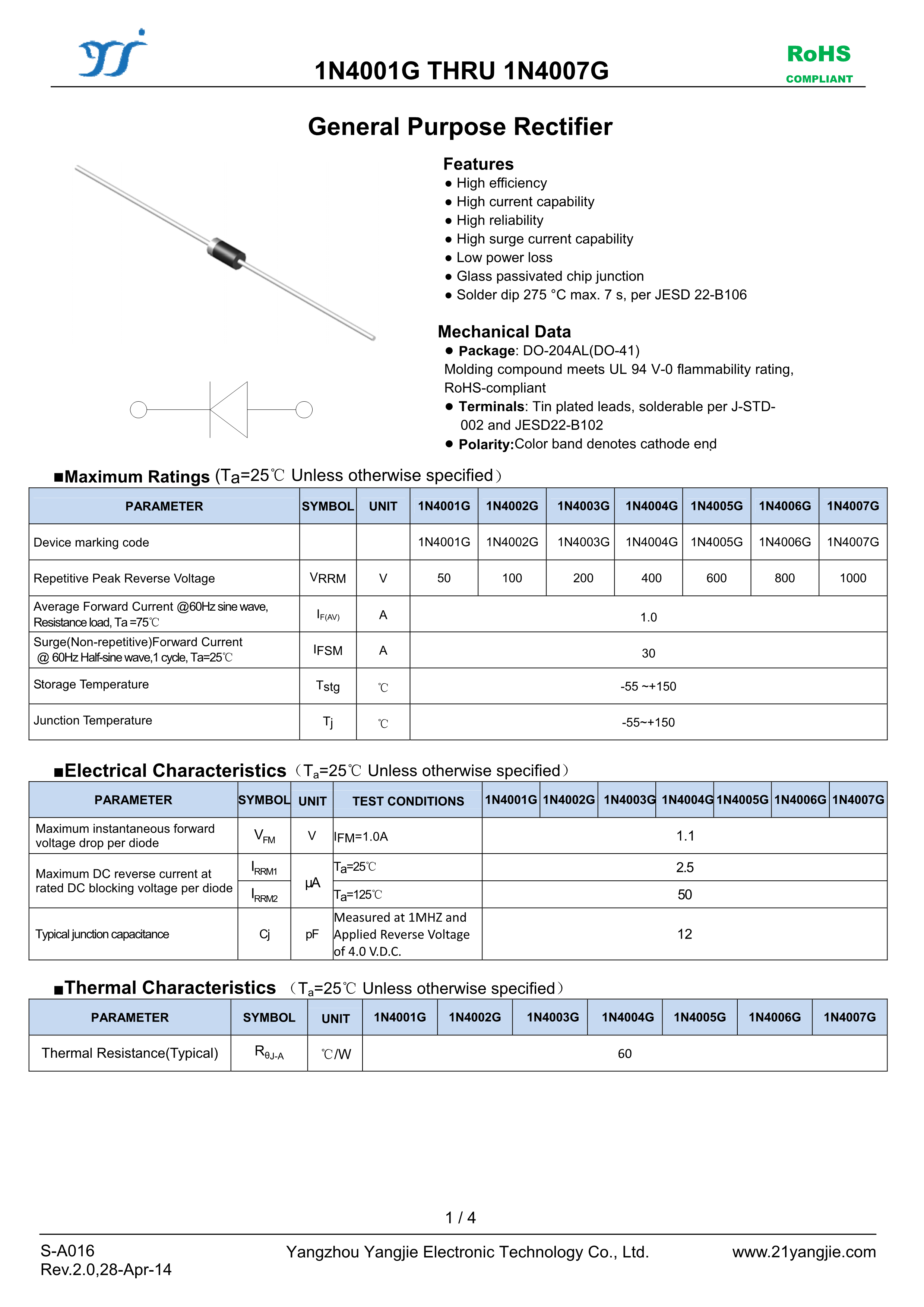1N4007数据手册DO-41封装YANGJIE(扬杰)PDF规格书,中英文下载