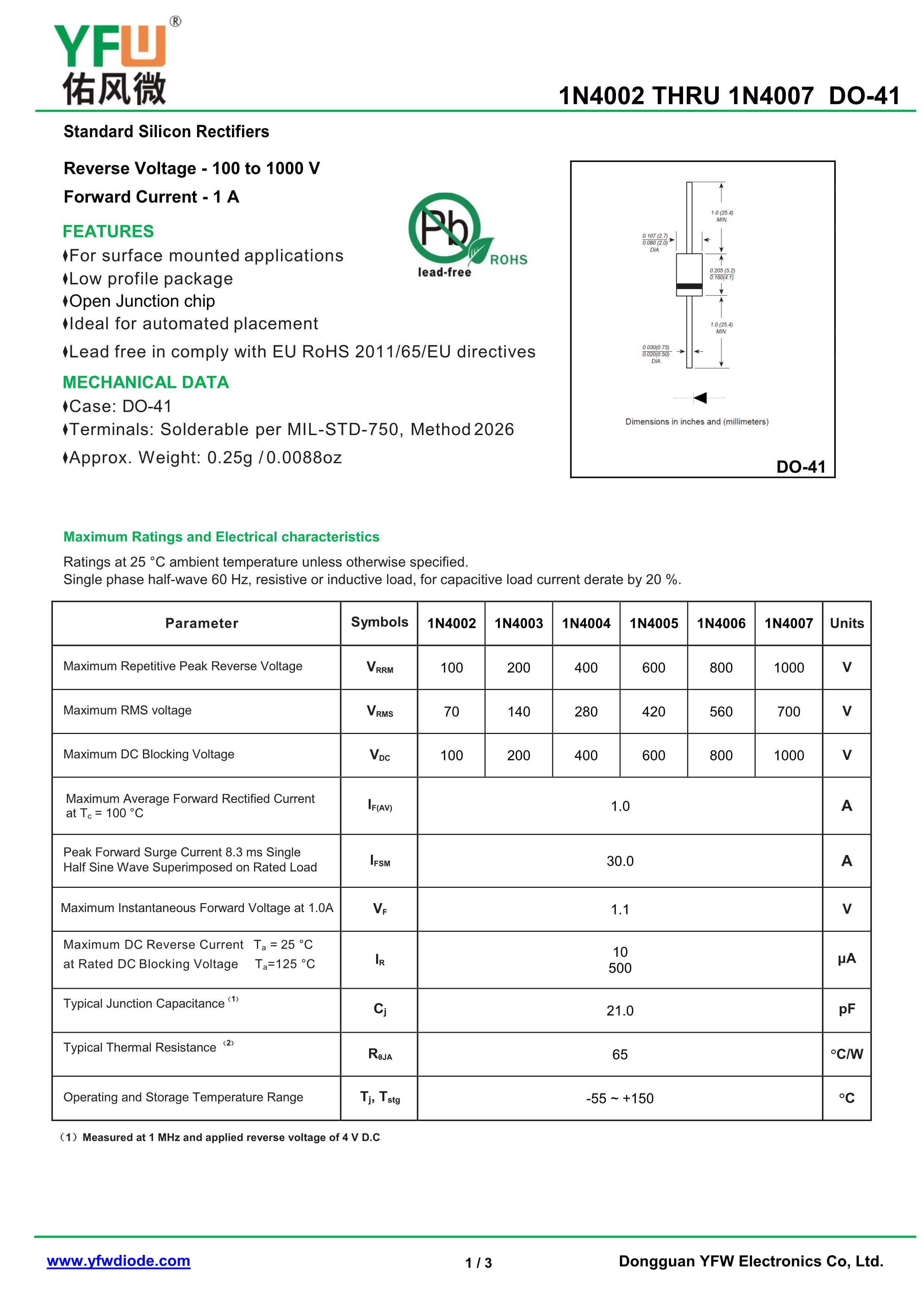 1N4007数据手册DO-41封装YFW(佑风微)PDF规格书,中英文下载