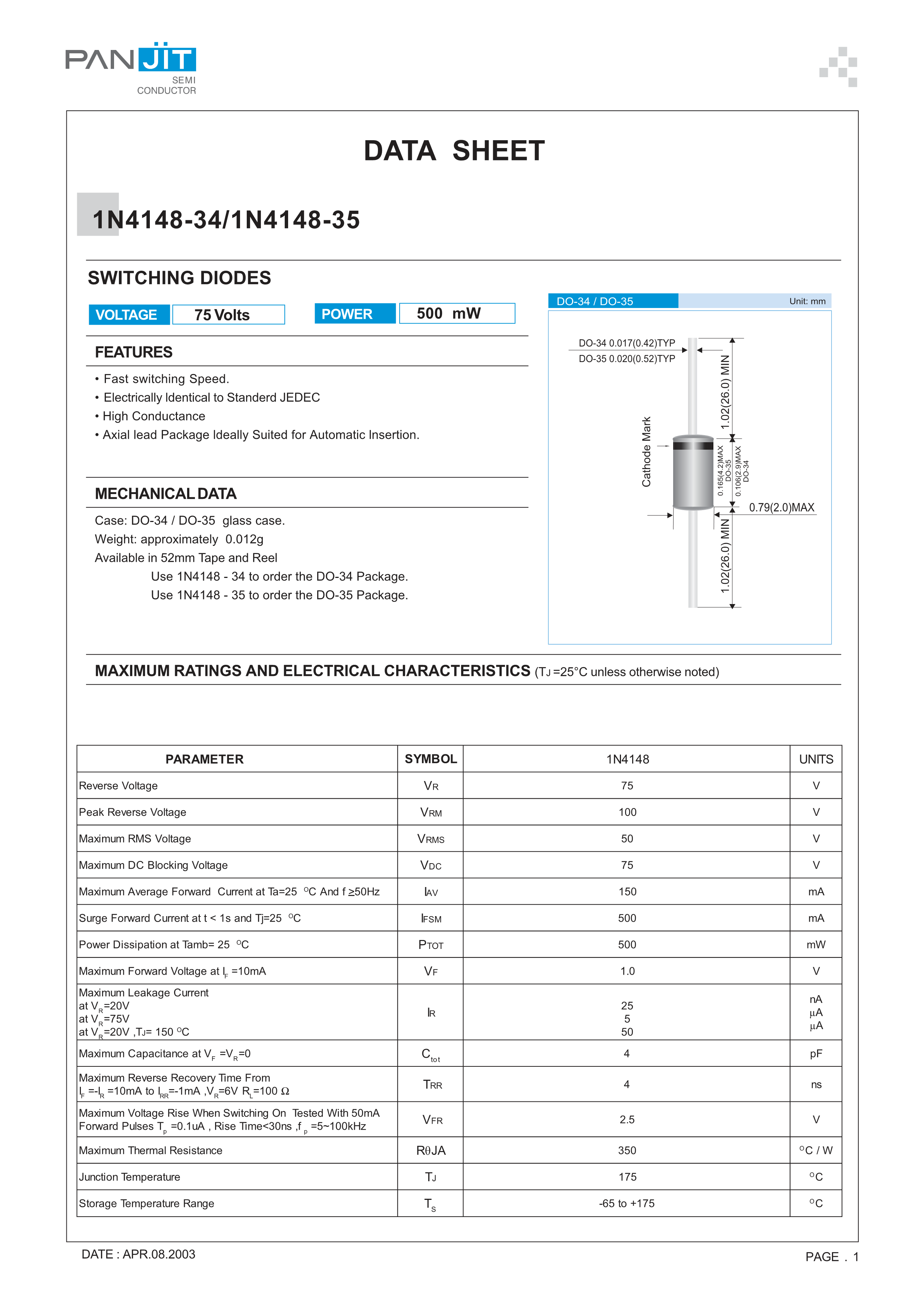 1N4148-35_AY_10001数据手册DO-35封装PANJIT(强茂)PDF规格书,中英文下