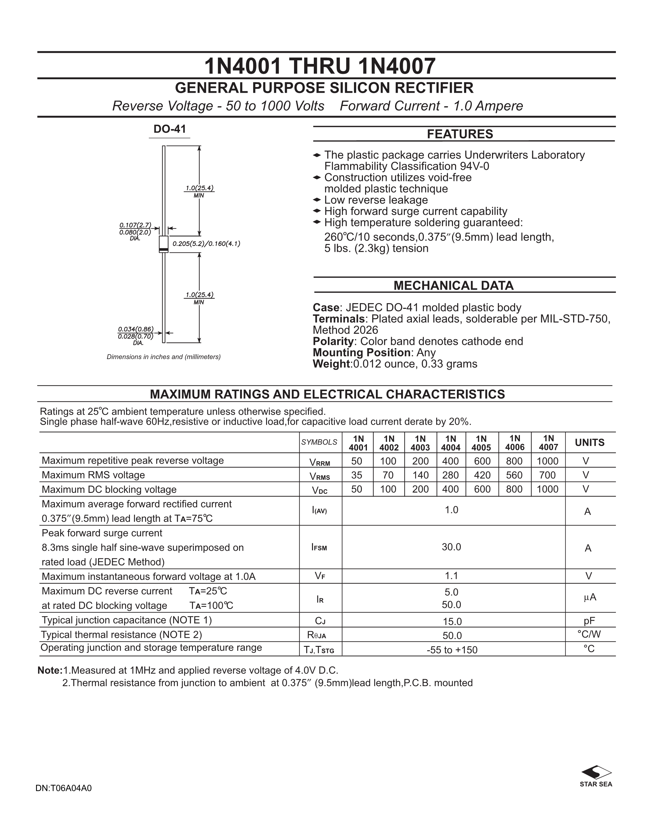 1N4007数据手册DO-41封装星海PDF规格书,中英文下载