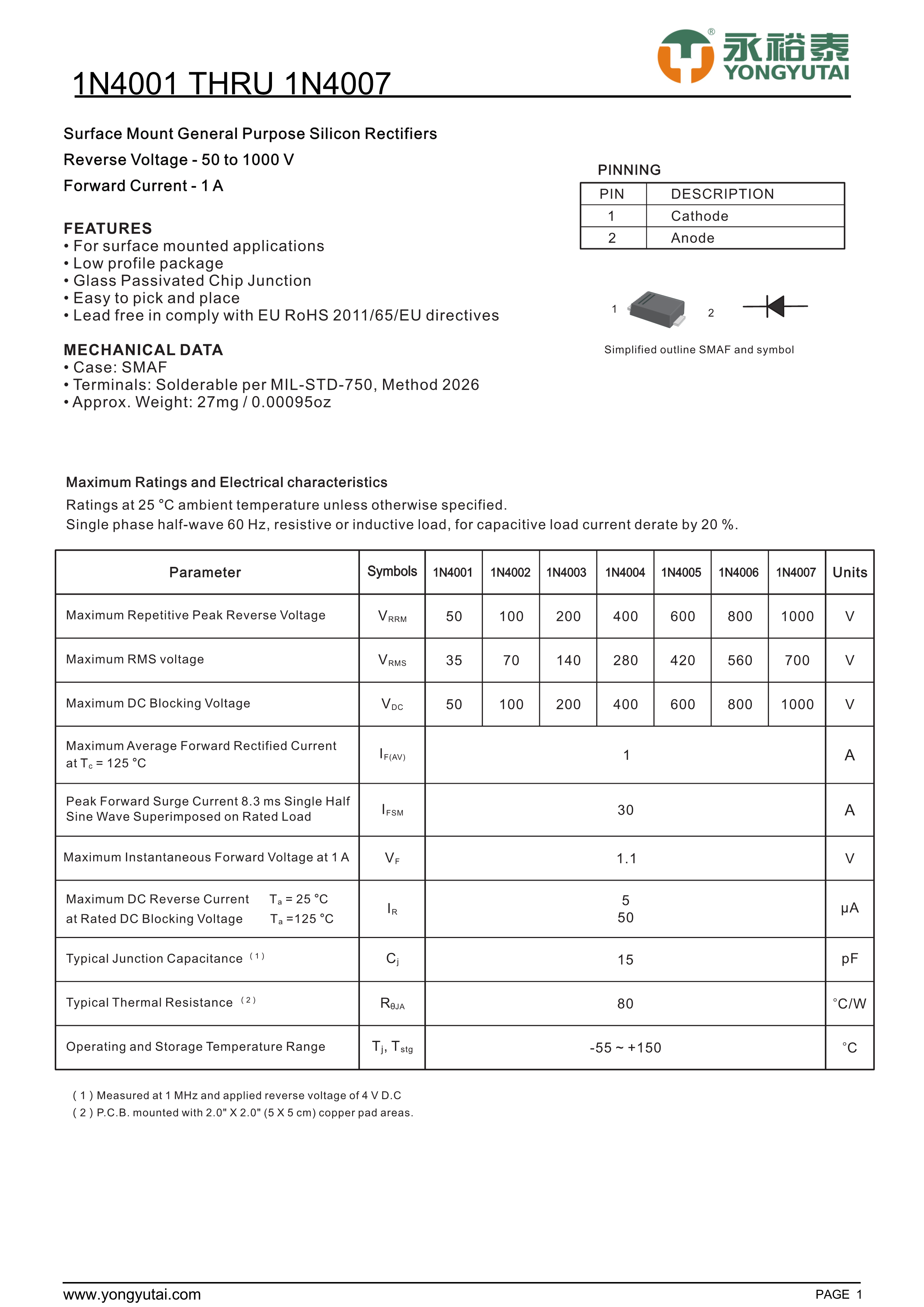 1N4007数据手册SMAF封装YONGYUTAI(永裕泰)PDF规格书,中英文下载