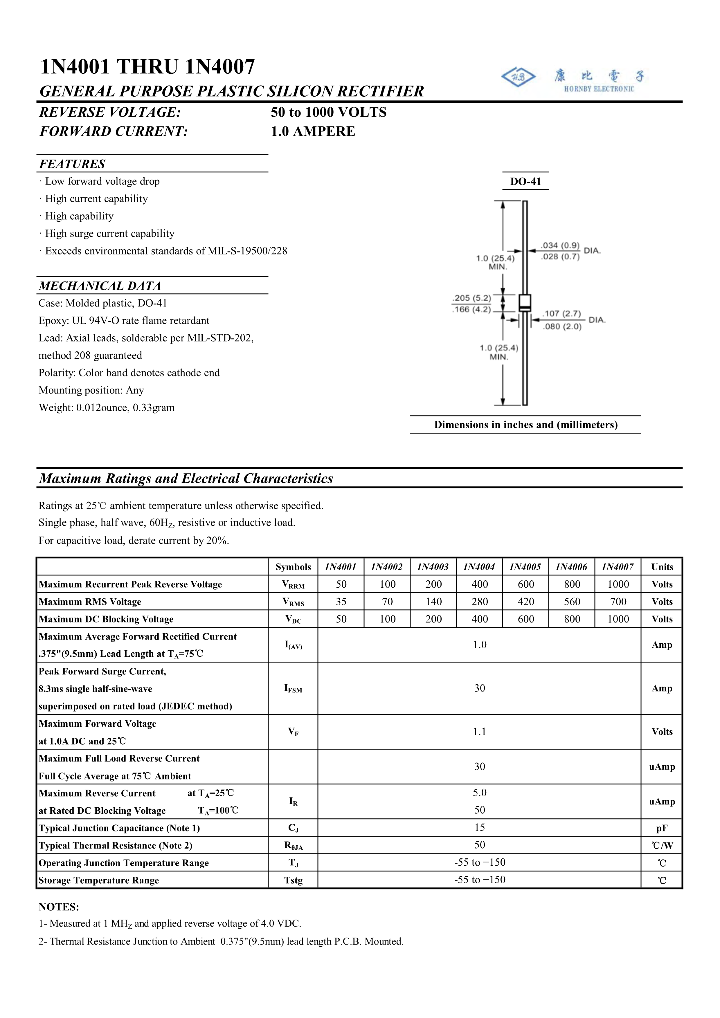 1N4007数据手册DO-41封装HORNBY ELECTRONIC(南通康比)PDF规格书,中英文